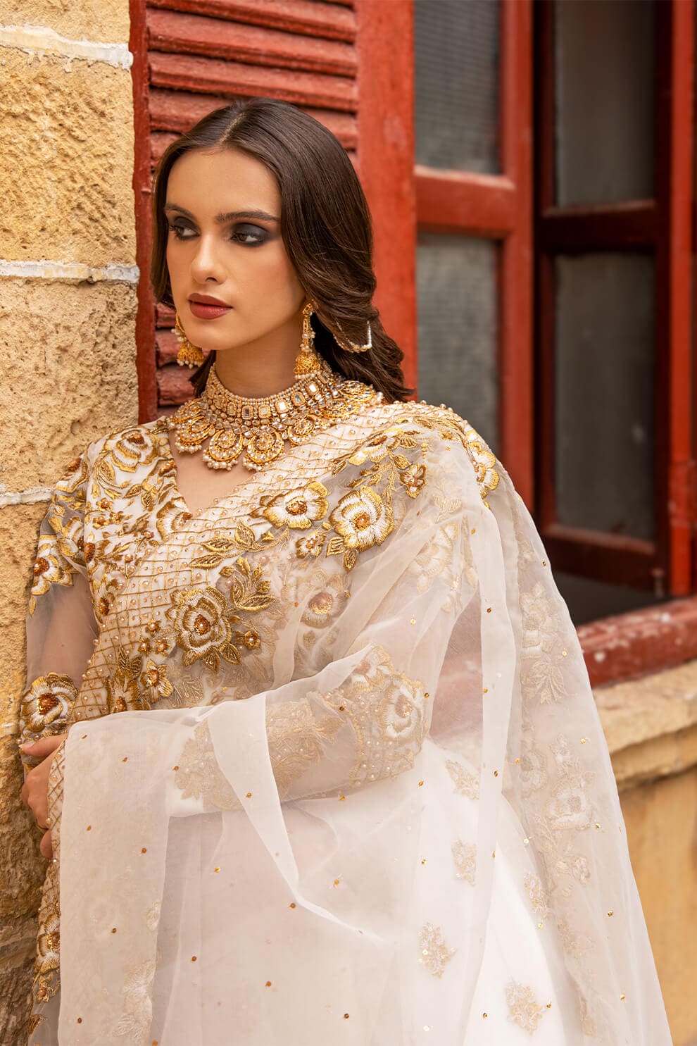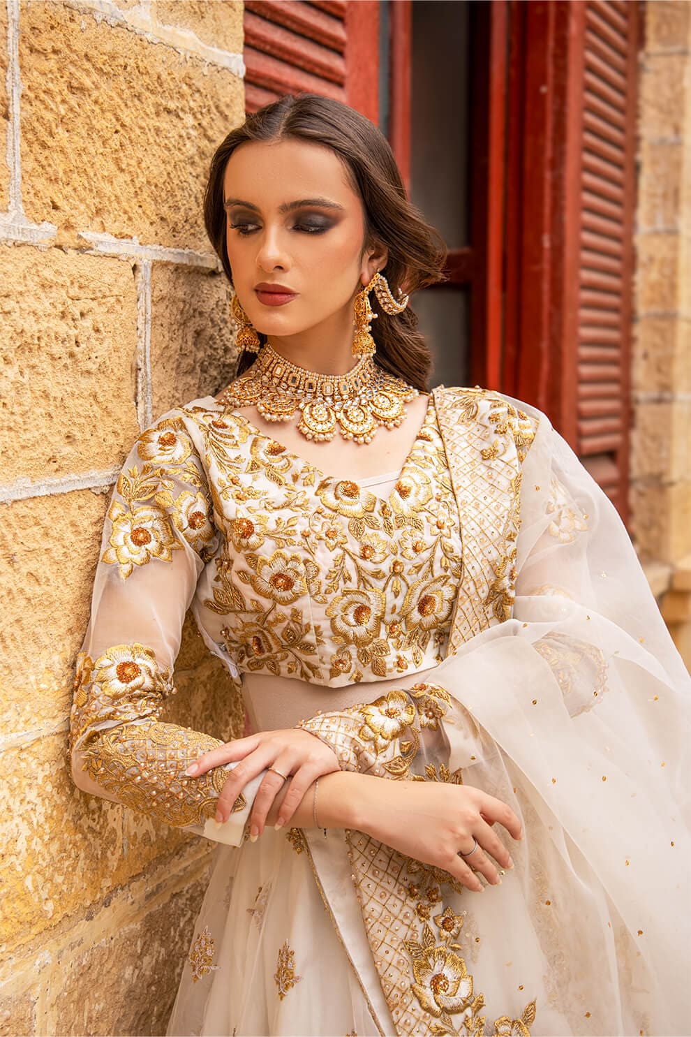 Captivating and celestial, Amirah epitomizes the epitome of refined artistry and distinctive design, exclusively curated for Zebaqi Bridals. The ensemble boasts exquisite detailing with a delicate blend of vintage sequins, resham, and tilla work on a lavish organza canvas. The striking silhouette of the choli lehenga is complemented by an intricately embroidered organza dupatta, delivering the ultimate in bridal opulence