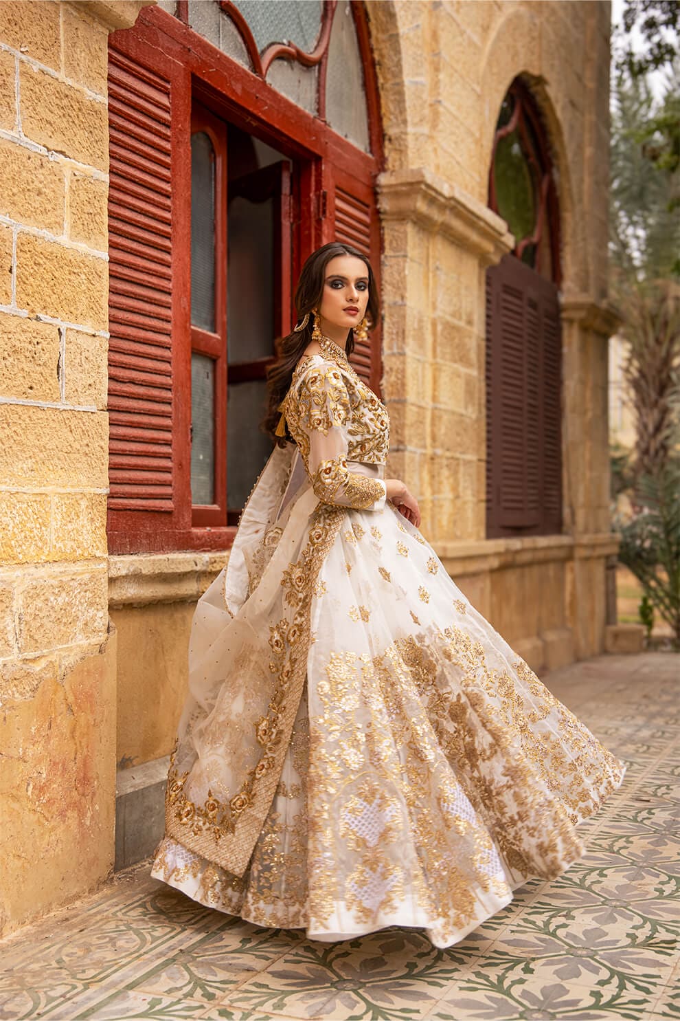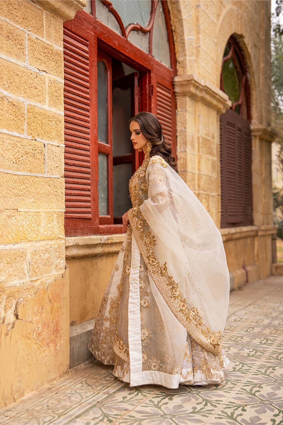 Captivating and celestial, Amirah epitomizes the epitome of refined artistry and distinctive design, exclusively curated for Zebaqi Bridals. The ensemble boasts exquisite detailing with a delicate blend of vintage sequins, resham, and tilla work on a lavish organza canvas. The striking silhouette of the choli lehenga is complemented by an intricately embroidered organza dupatta, delivering the ultimate in bridal opulence.