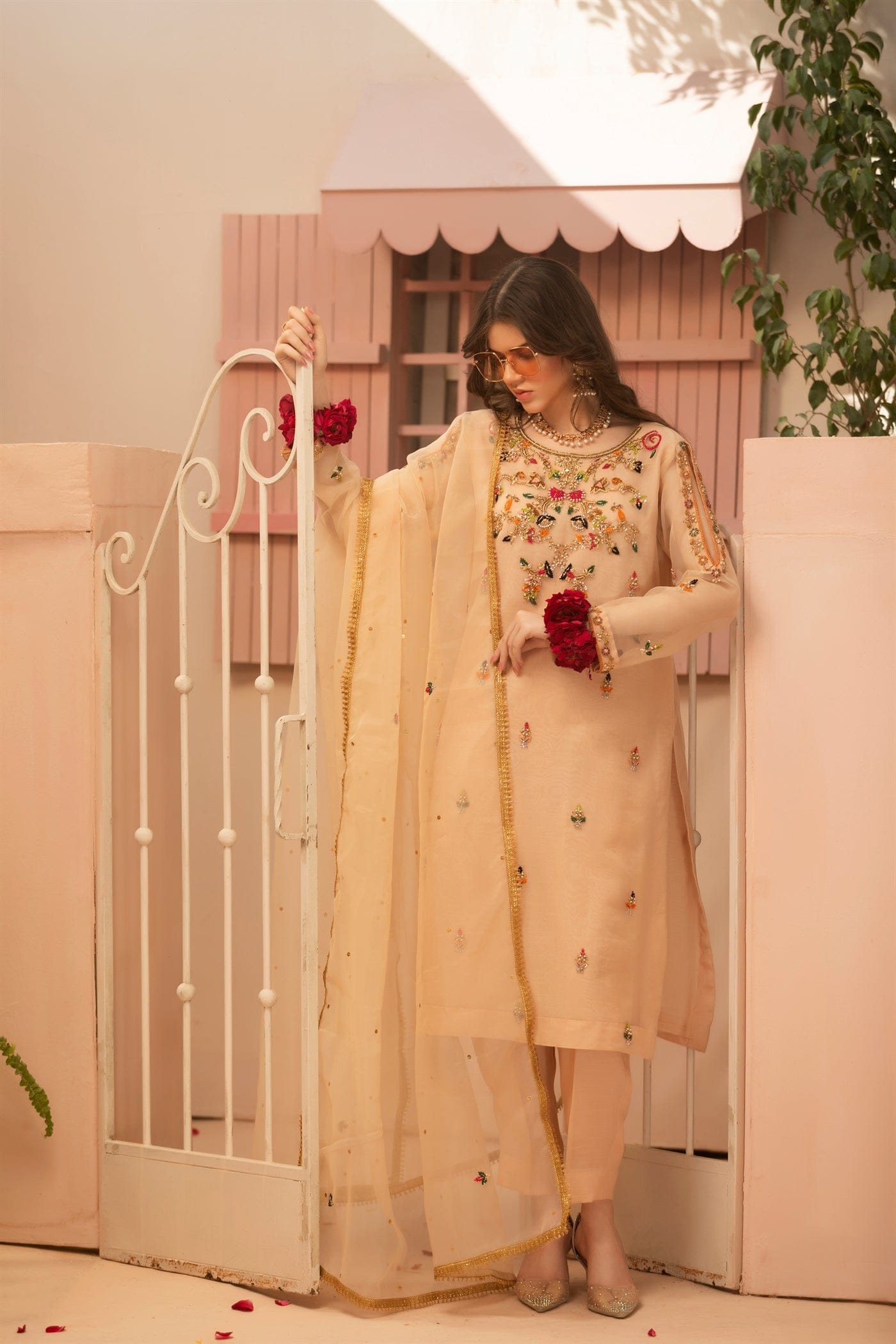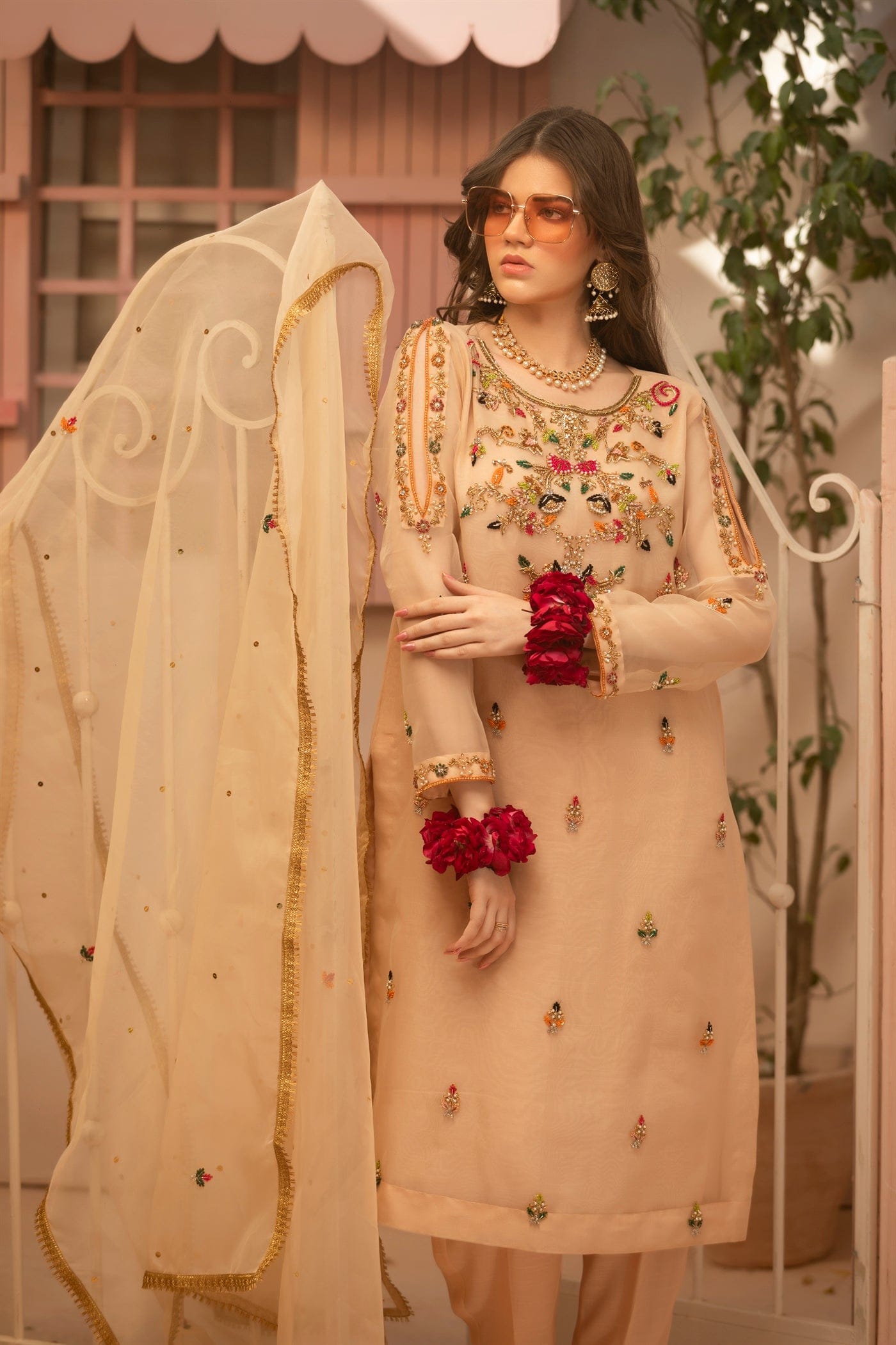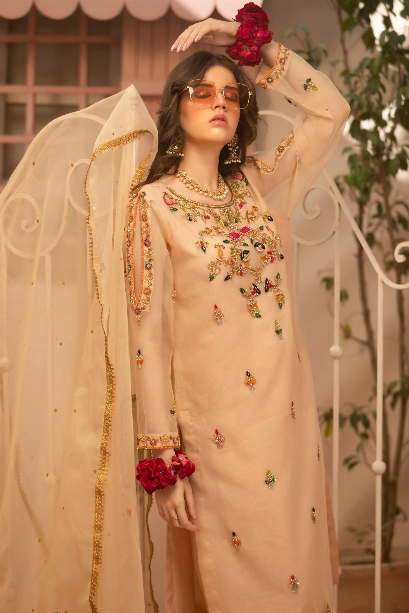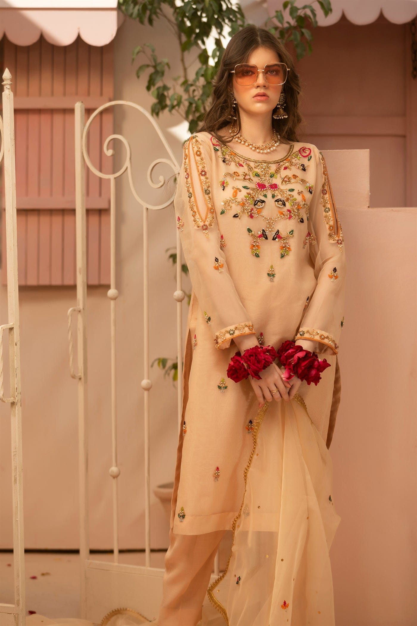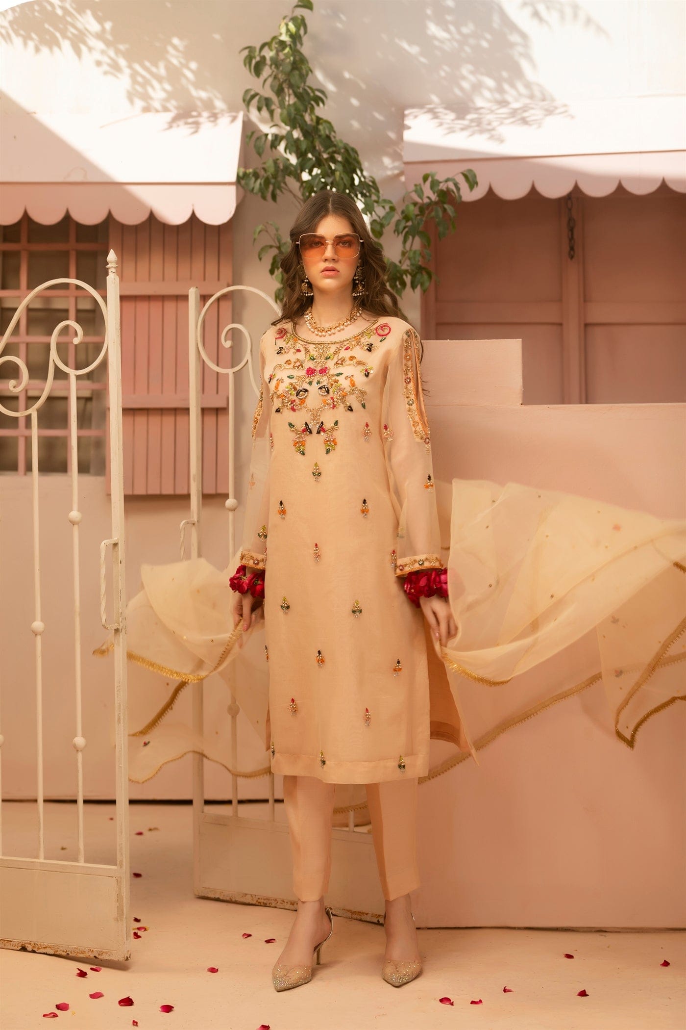 - HAND-EMBROIDERED FULL-SLEEVED COLD SHOULDER SHIRT WITH HANDWORK ON THE FRONT AND SLEEVES. EMBELLISHED WITH, SILVER SEQUINS, KAT DANA, DROP PEARL, MOTI, CRYSTAL, KORA, AND DABKA. PAIRED WITH STRAIGHT PANTS AND GOTTA FINISHED WITH SPRAYED HAND EMBROIDERED SEQUINS CHANN AND MOTIF DUPATTA.