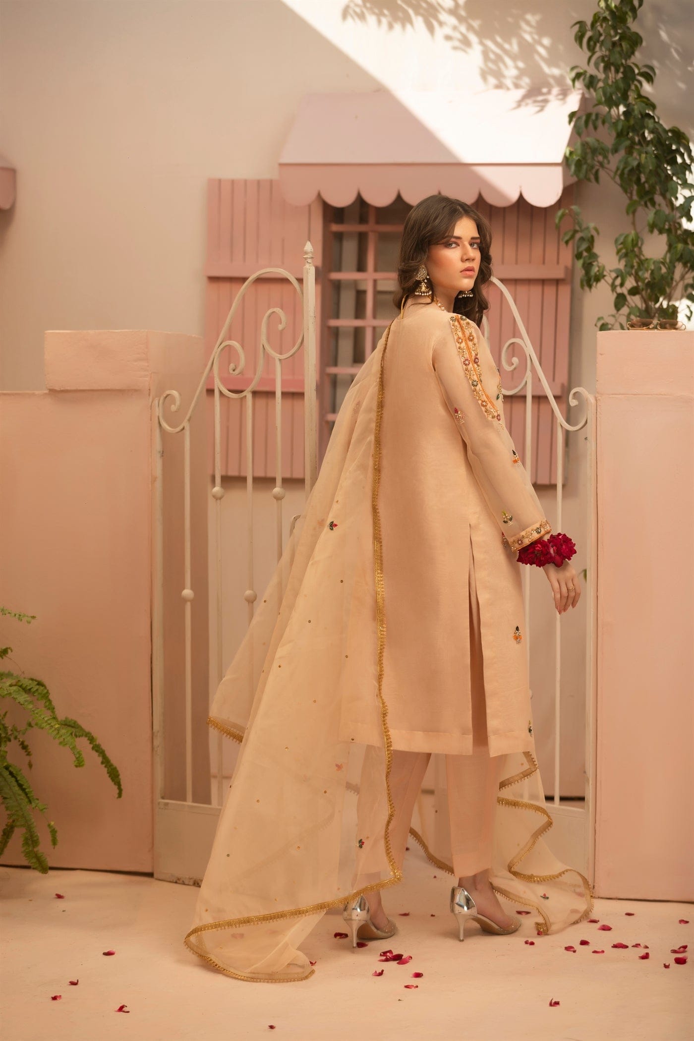 Hand-embroidered full-sleeved cold shoulder shirt with handwork on the front and sleeves. Embellished with, silver sequins, kat dana, drop pearl, moti, crystal, kora, and dabka. Paired with straight pants and gotta finished with sprayed hand embroidered sequins chann and motif dupatta.