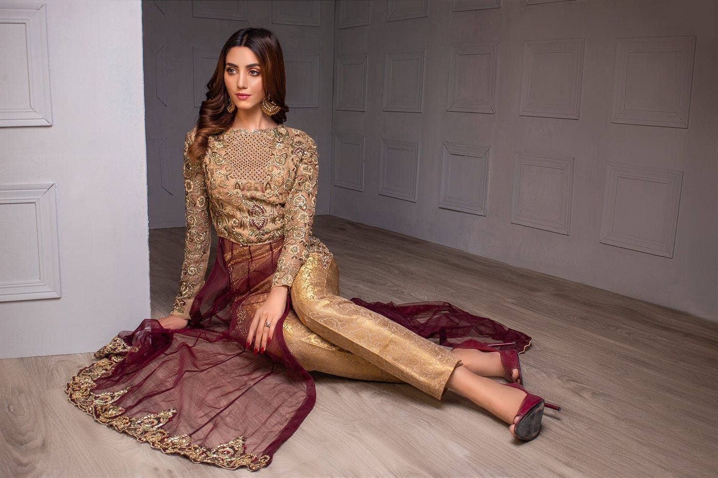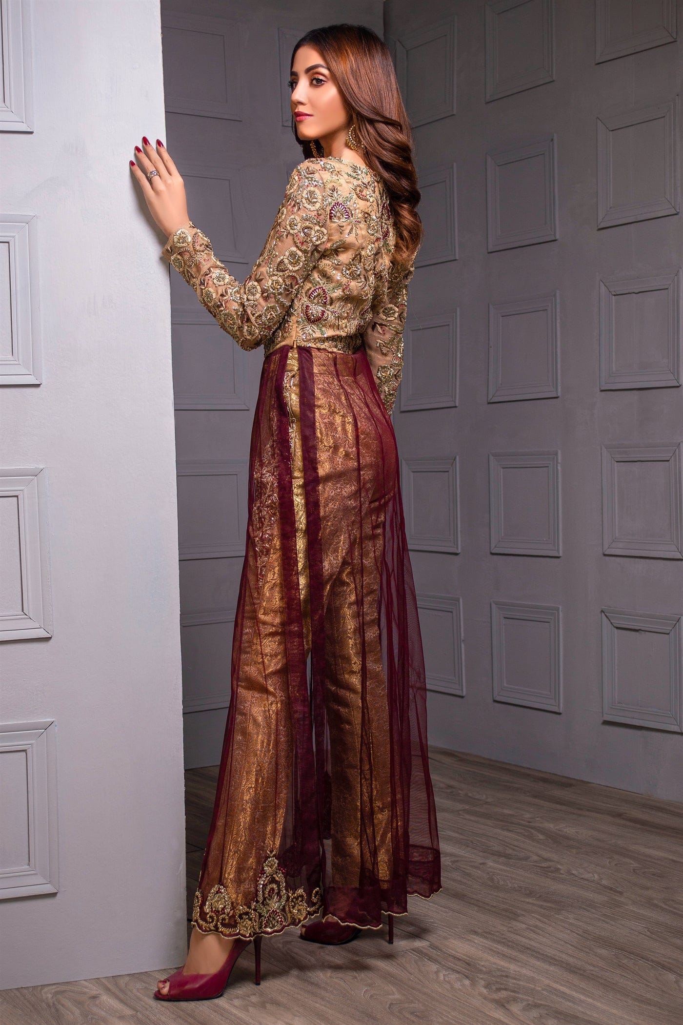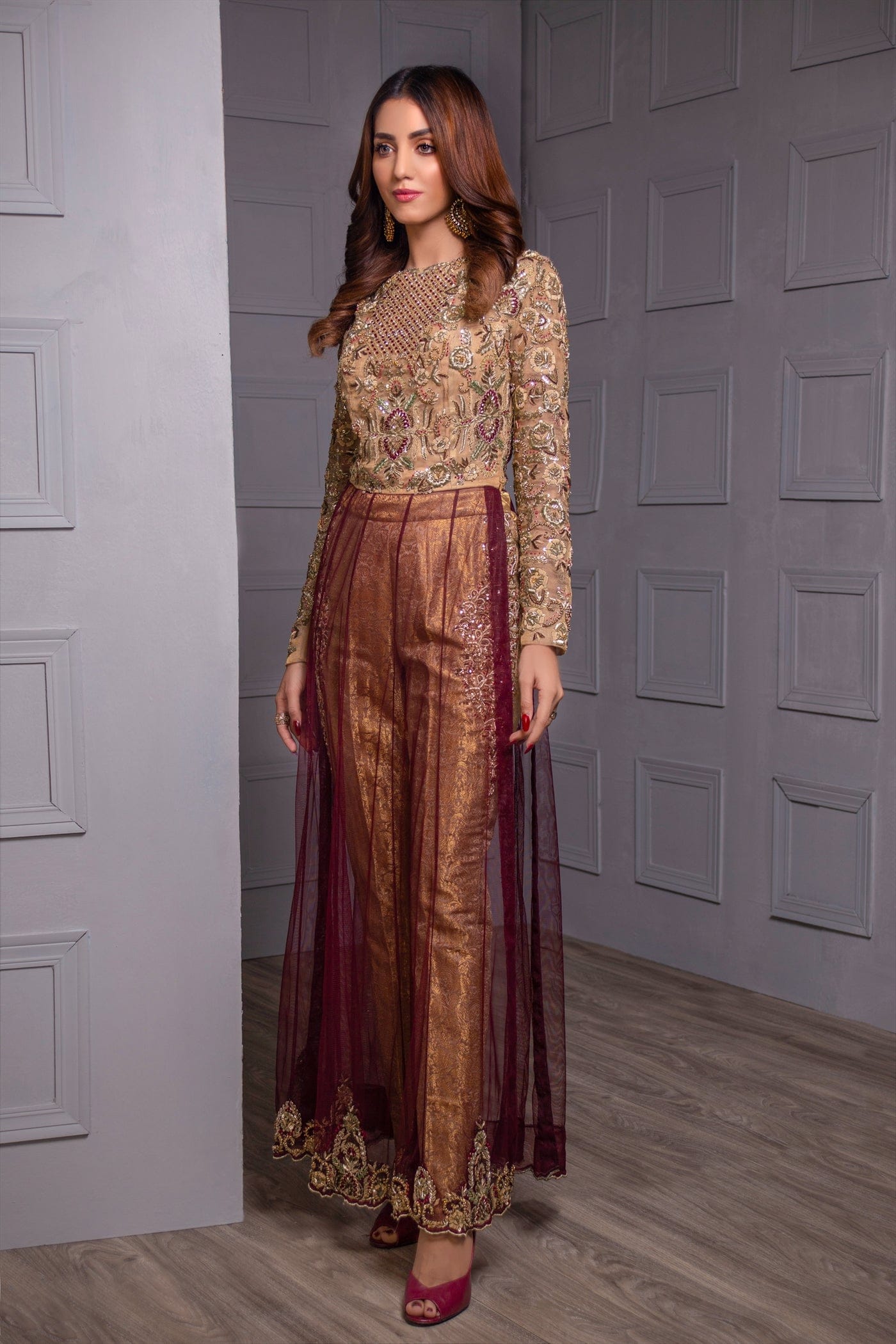 Heavily hand embroidered full-sleeved high slit open shirt with hand work on the bodice front and back, full sleeves embellished with, golden kat dana, drop pearl, moti, crystal, kora, and dabka. Gotta stylized hem. Paired with banarasi straight pants which have work on the sides.
