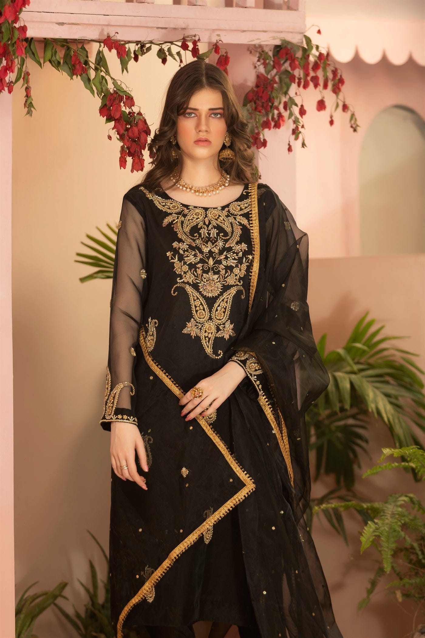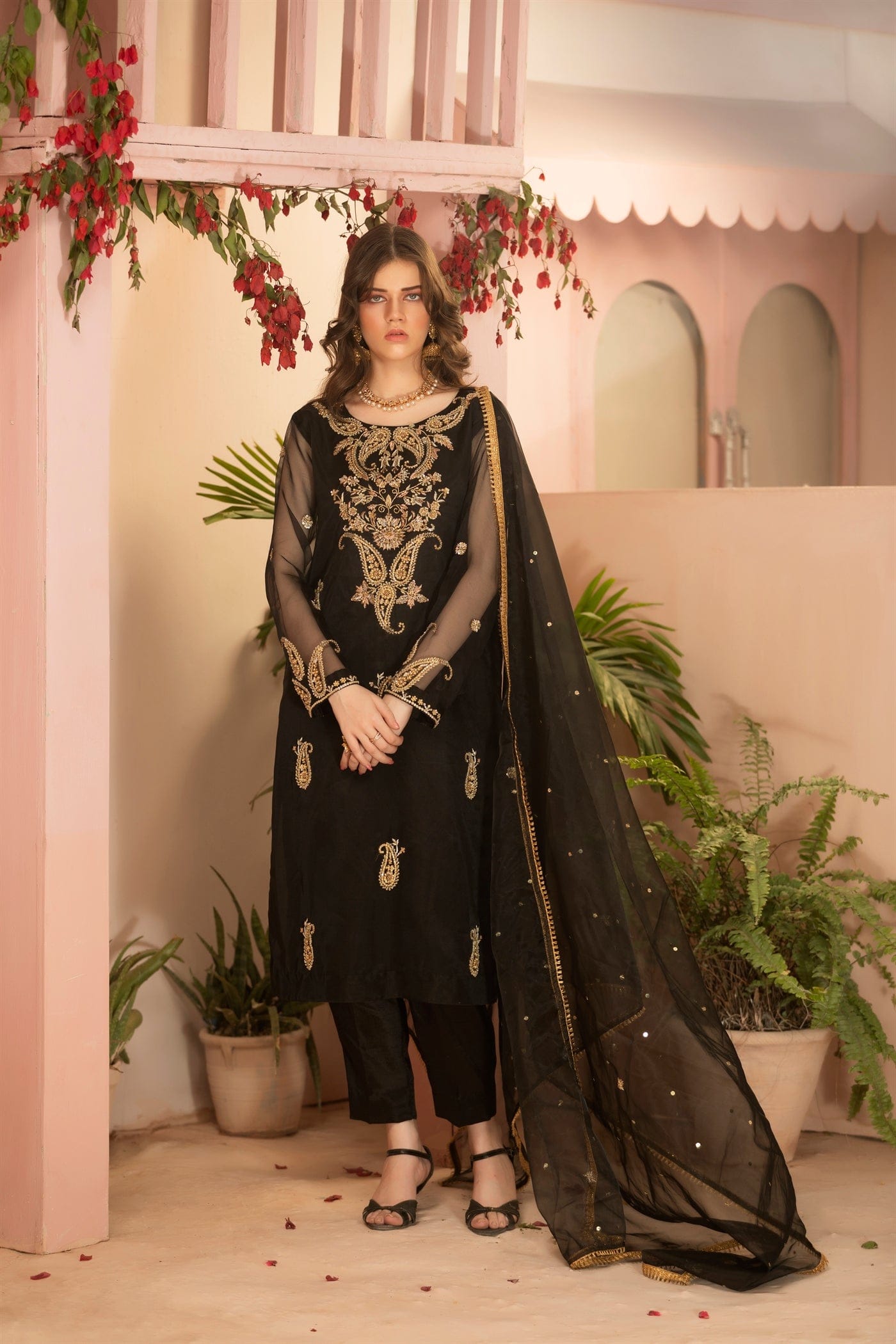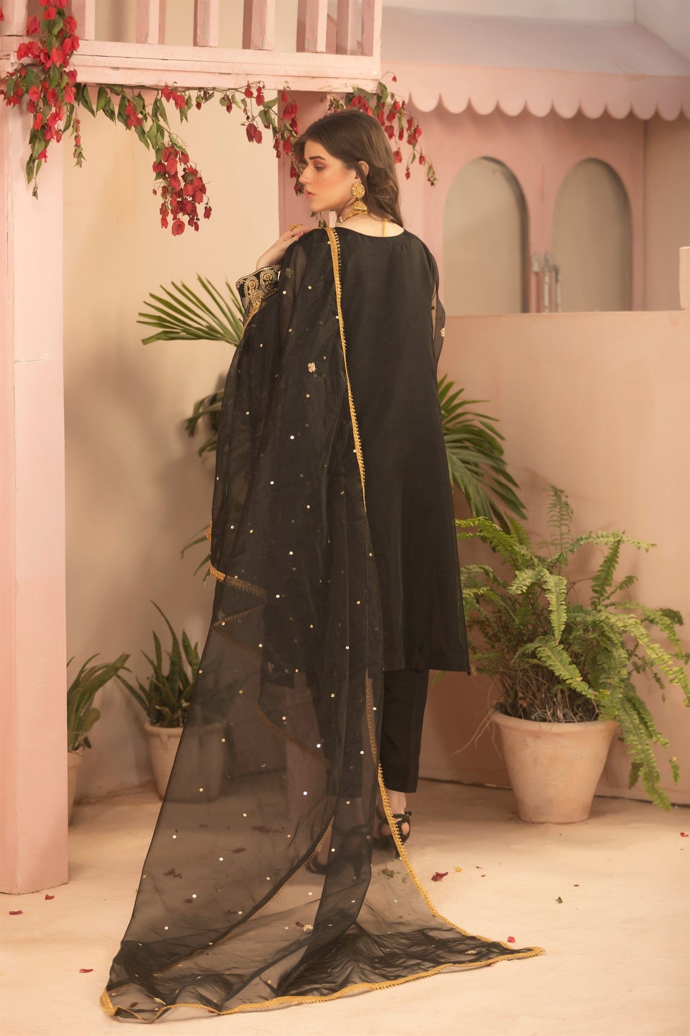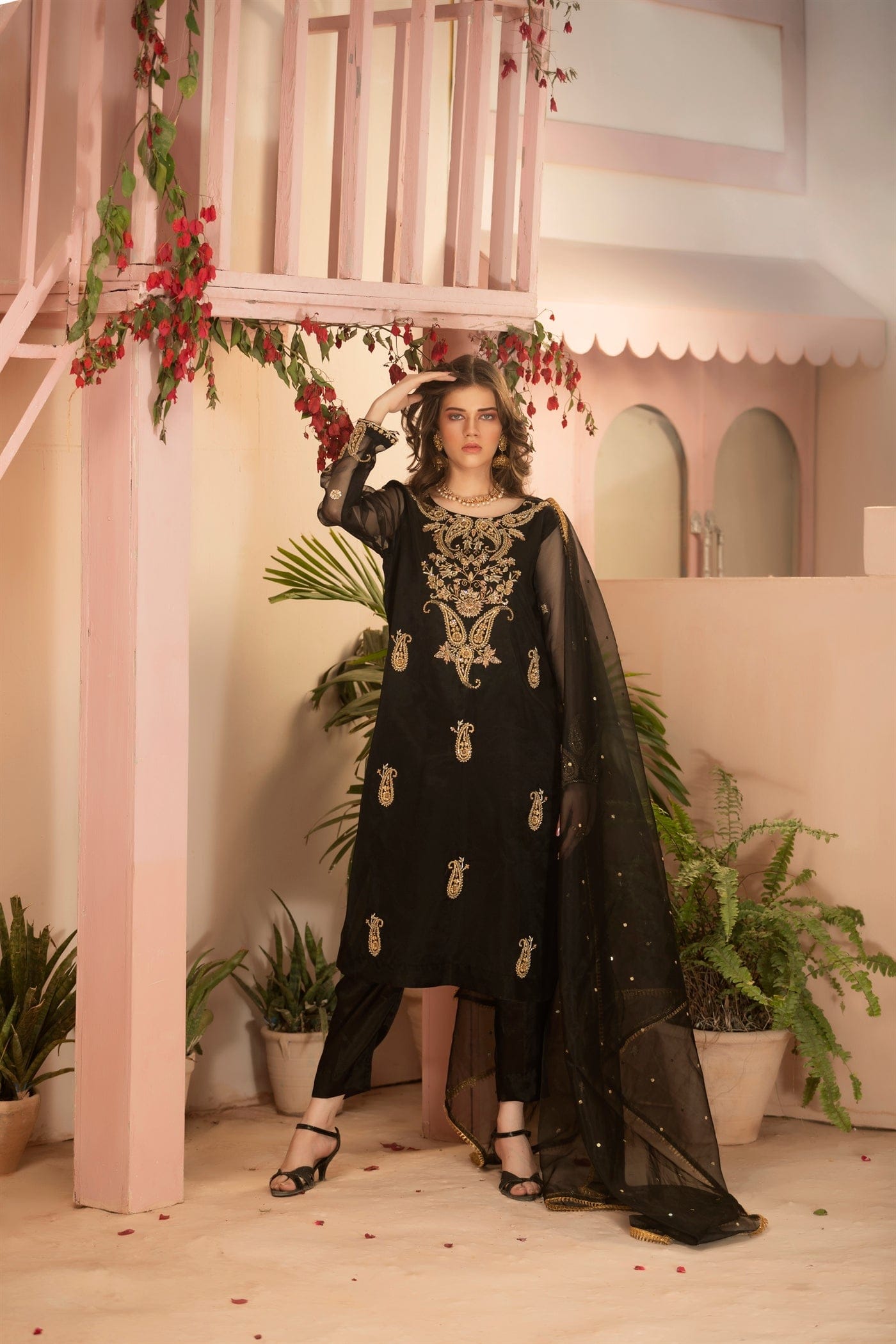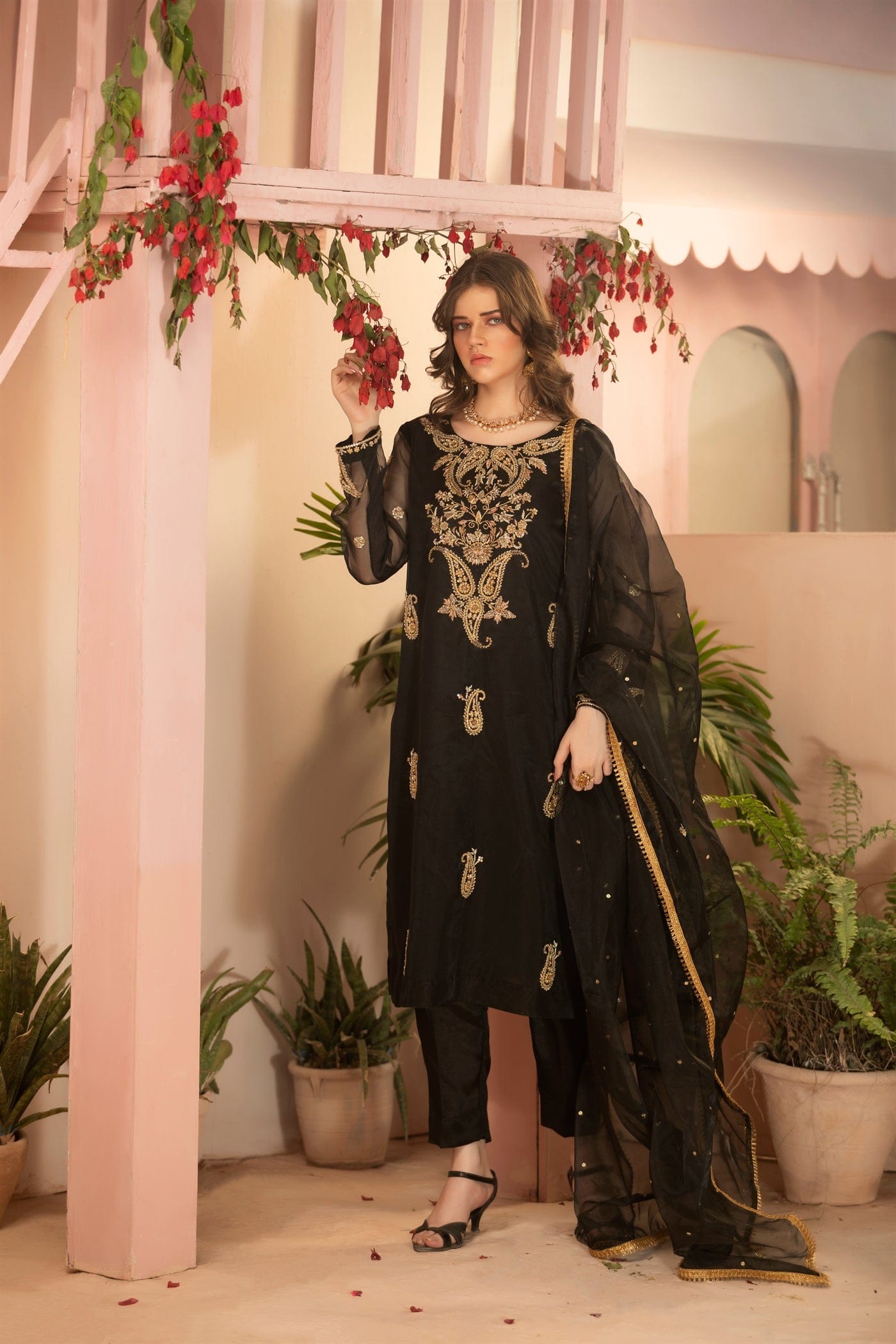 - HAND-EMBROIDERED FULL-SLEEVED SHIRT WITH HEAVY HANDWORK ON THE FRONT AND SLEEVES. EMBELLISHED WITH, GOLDEN SEQUINS, KAT DANA, DROP PEARL, MOTI, CRYSTAL, SQUARE MATT SEQUINS, KORA, AND DABKA. PAIRED WITH STRAIGHT PANTS AND GOTTA FINISHED WITH SPRAYED HAND EMBROIDERED SEQUINS CHANN AND MOTIF DUPATTA.