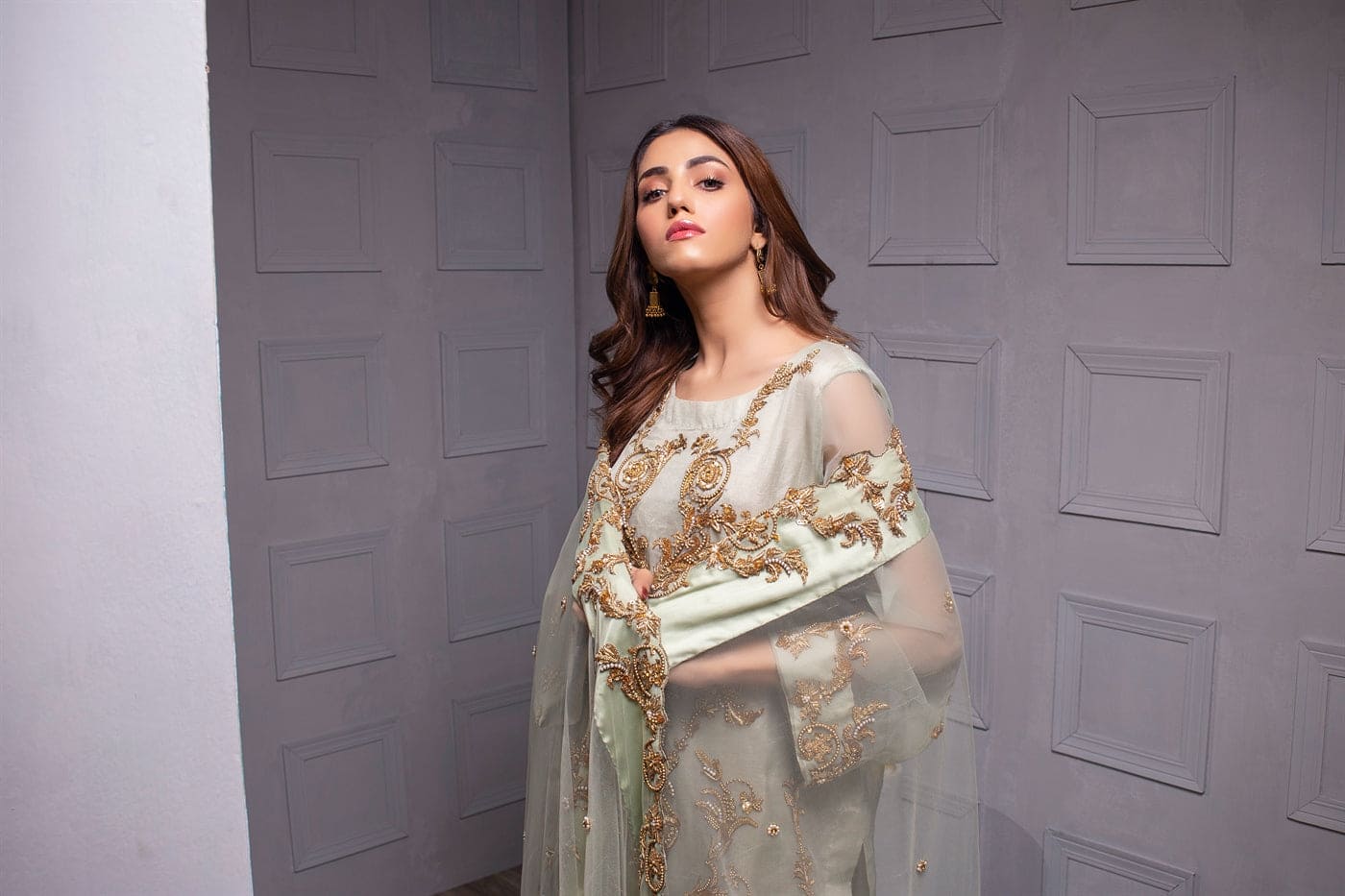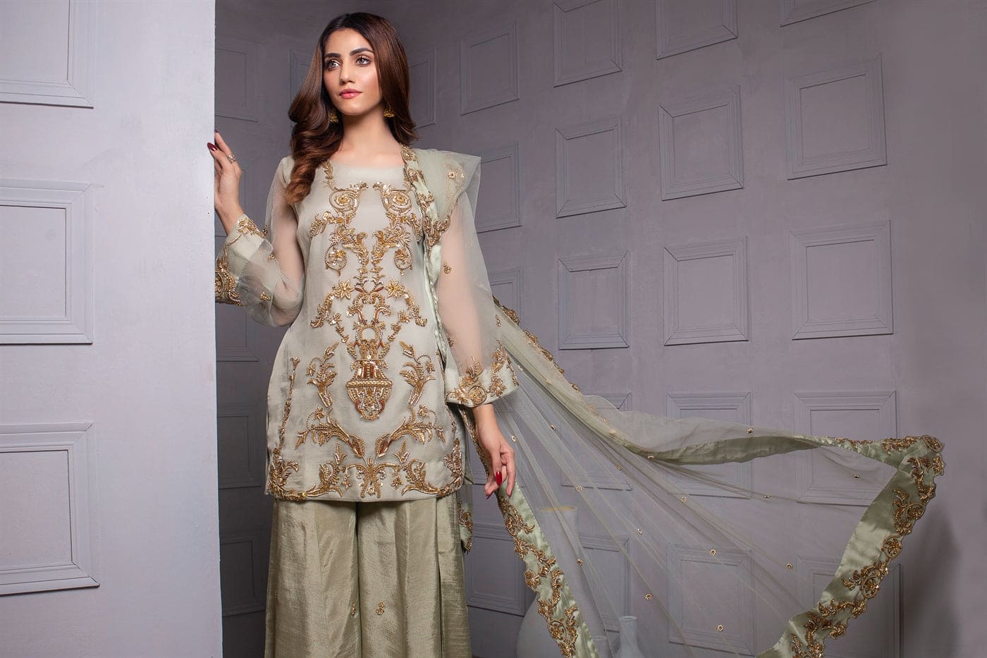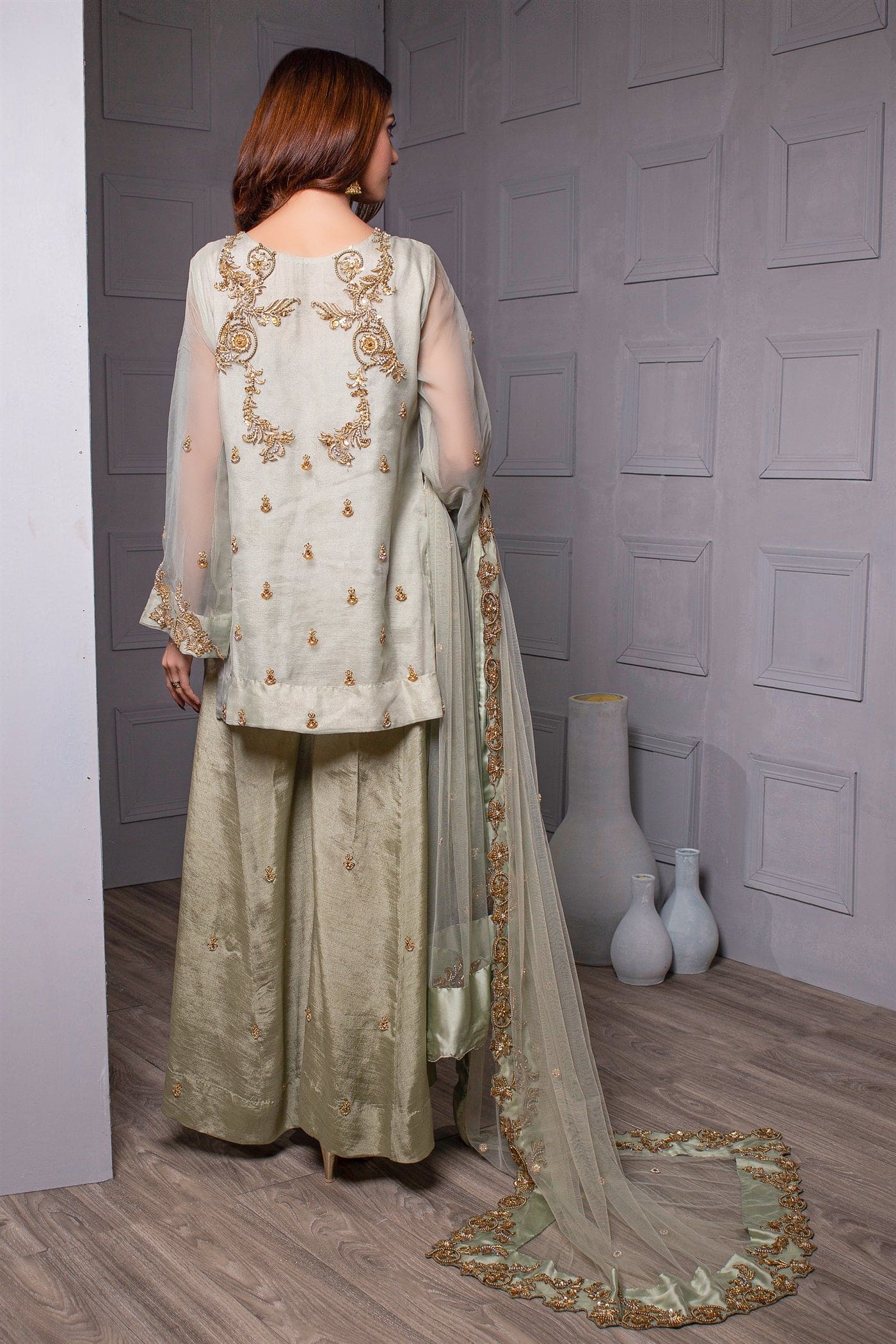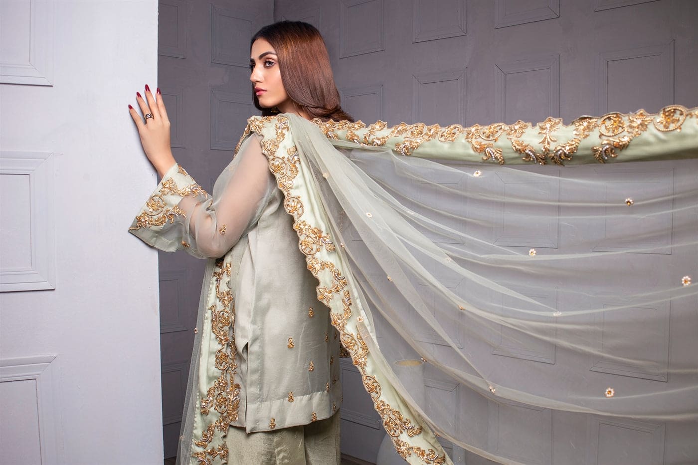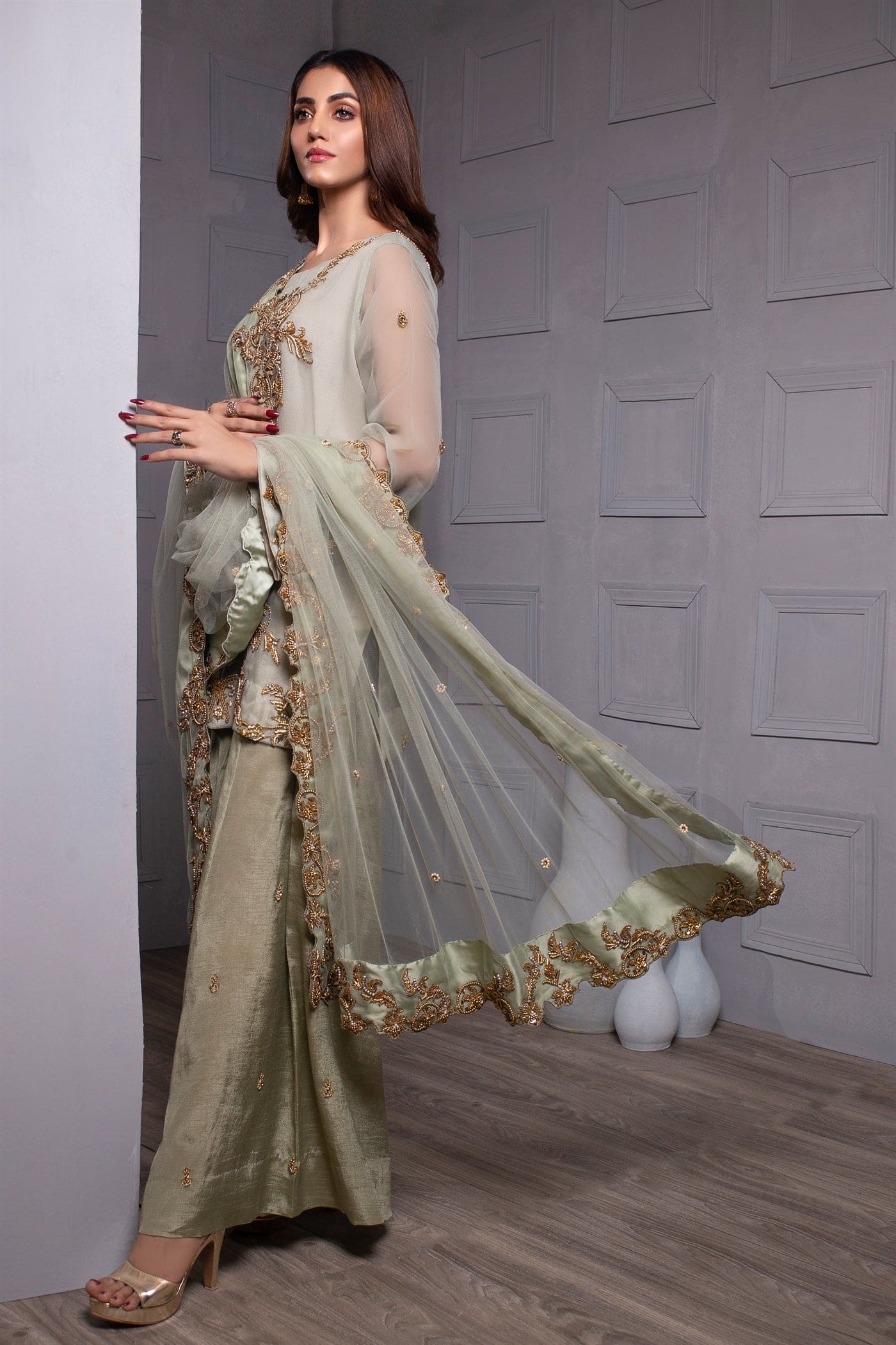 - HAND EMBROIDERED FULL-SLEEVED SHIRT WITH HAND WORK ON THE FRONT, BACK, AND, SLEEVES EMBELLISHED WITH, ANTIQUE GOLD KAT DANA, DROP PEARL, MOTI, CRYSTAL, KORA, AND DABKA. PAIRED WITH HAND-EMBROIDERED MOTIFS ON THE HEM OF PALAZZO PANTS AND A DUPATTA HEAVILY HAND-EMBROIDERED ON 4 SIDES. SPRAYED WITH CHANN AND MOTIFS.