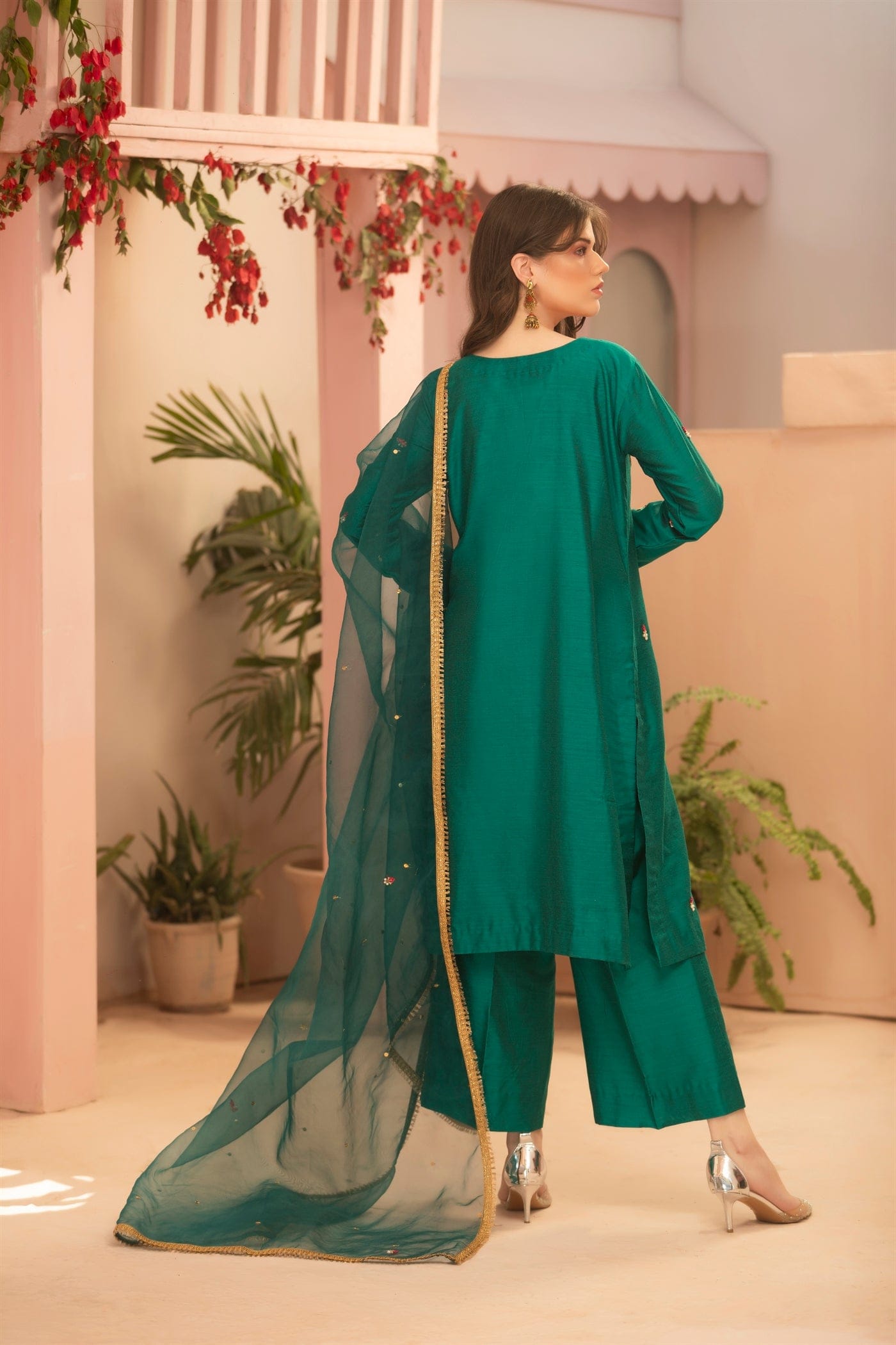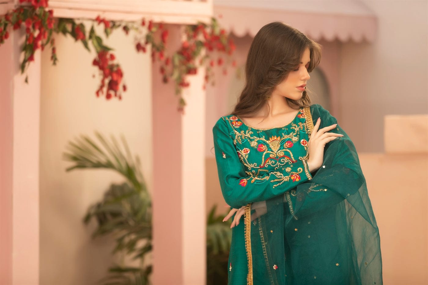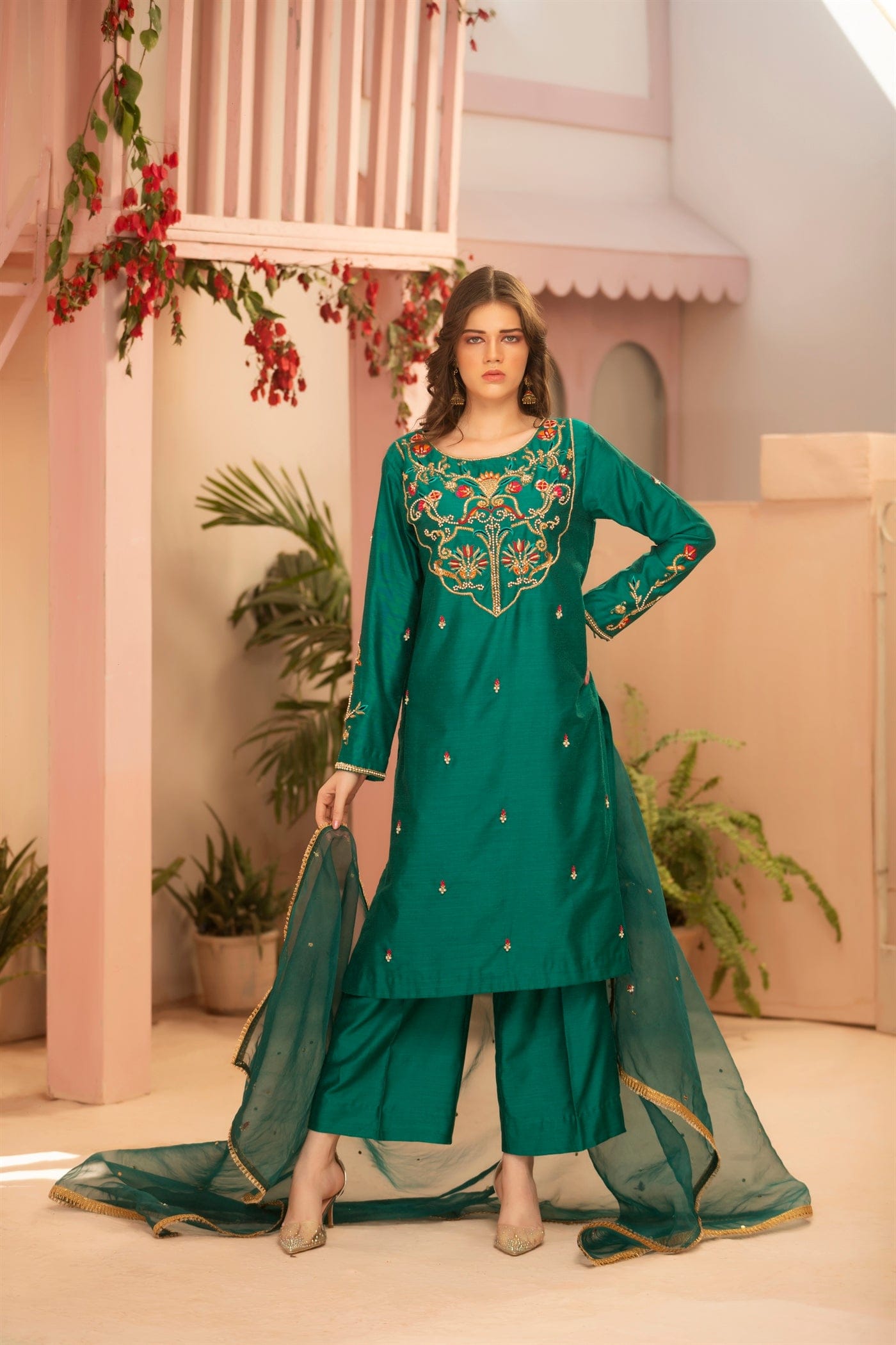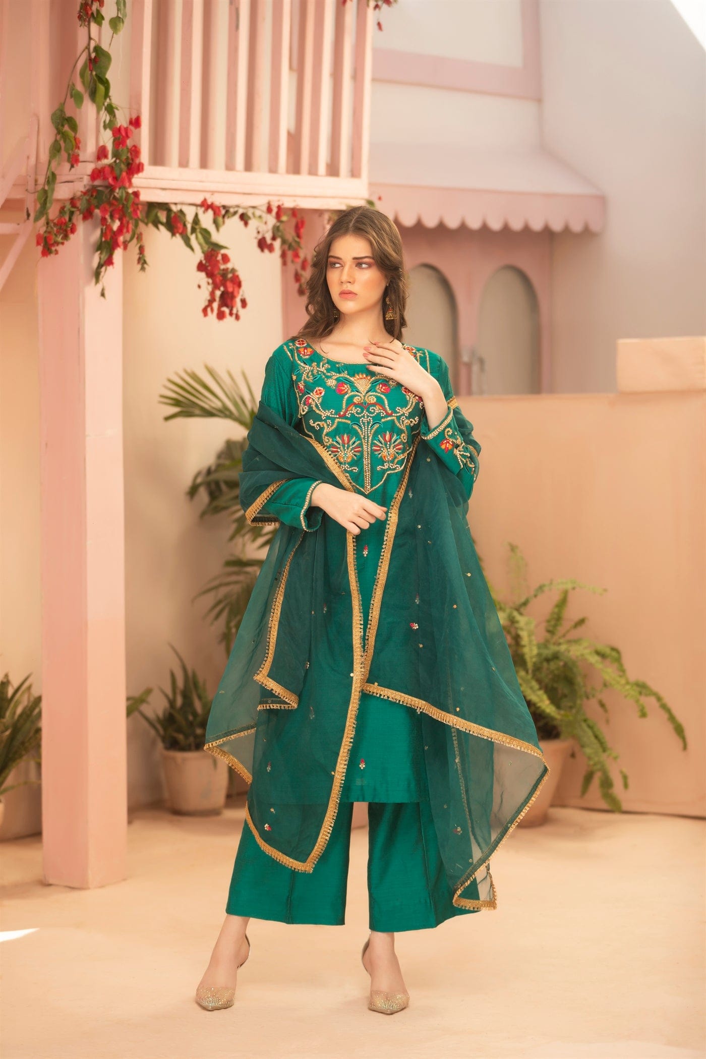 - HAND-EMBROIDERED FULL-SLEEVED SHIRT WITH HANDWORK ON THE FRONT AND SLEEVES. EMBELLISHED WITH, COLORFUL RESHAM, GOLDEN SEQUINS, KAT DANA, DROP PEARL, MOTI, CRYSTAL, KORA, AND DABKA. PAIRED WITH WIDE-LEG PANTS AND GOTTA FINISHED WITH SPRAYED HAND-EMBROIDERED SEQUINS CHANN AND MOTIF DUPATTA.