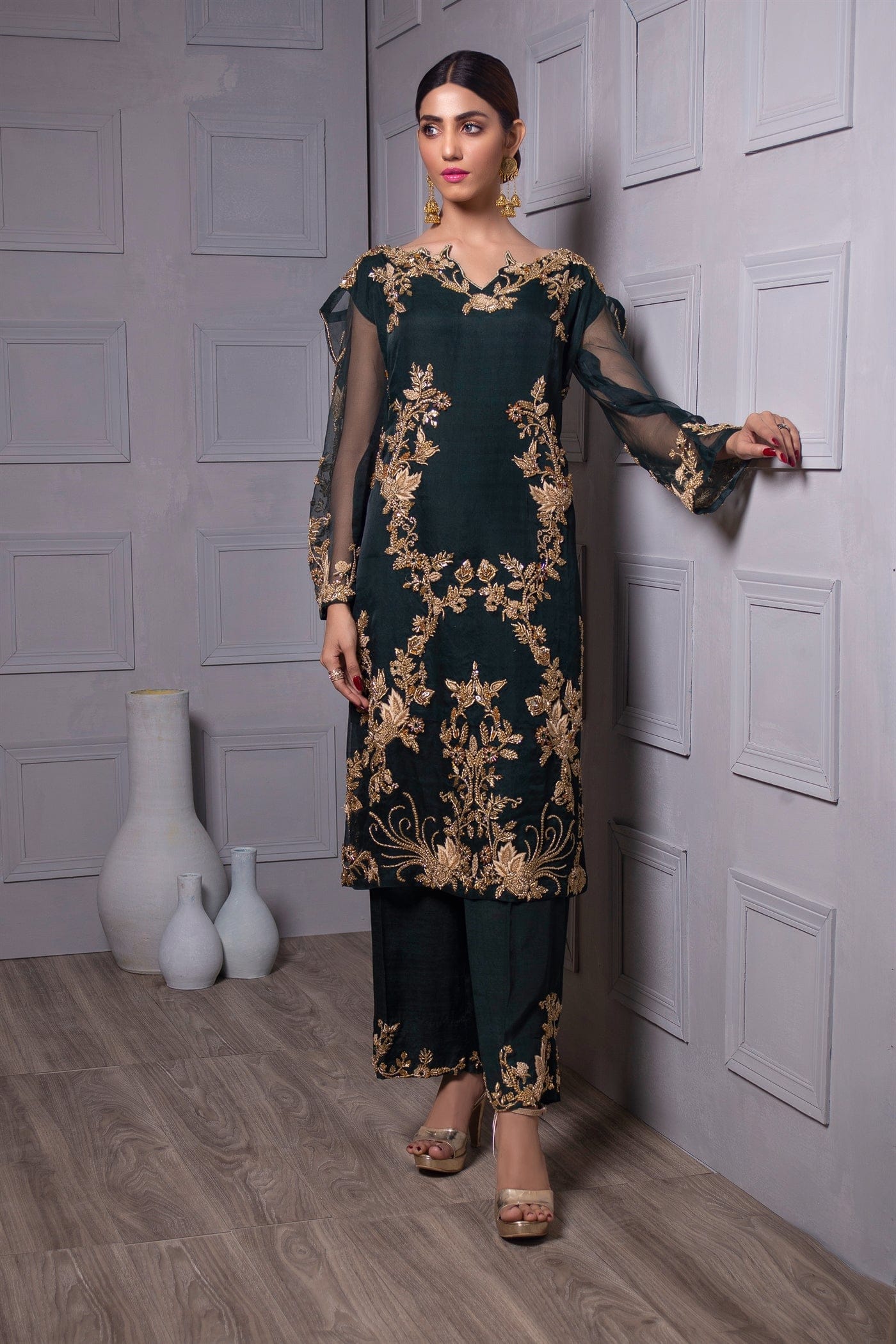 - HAND-EMBROIDERED FULL-SLEEVED DROP SHOULDER SHIRT WITH HANDWORK ON THE FRONT, BACK, AND SLEEVES. APPLIQUED AND EMBELLISHED WITH, GOLDEN SEQUINS, KAT DANA, DROP PEARL, MOTI, CRYSTAL, KORA, AND DABKA. PAIRED WITH WIDE-LEG PANTS HAS INTRICATE MOTIFS ON THE HEM.