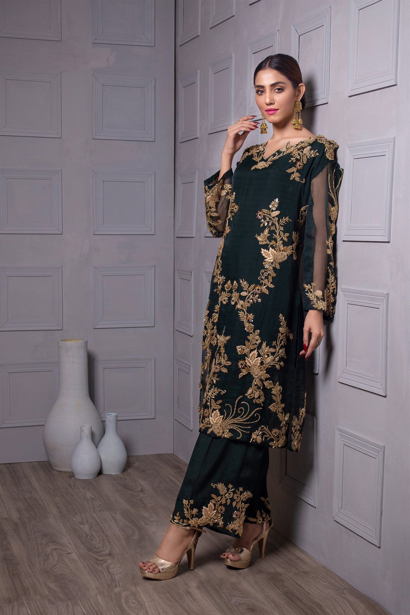 Hand-embroidered full-sleeved drop shoulder shirt with handwork on the front, back, and sleeves. Appliqued and embellished with, golden sequins, kat dana, drop pearl, moti, crystal, kora, and dabka. Paired with wide-leg pants has intricate motifs on the hem.