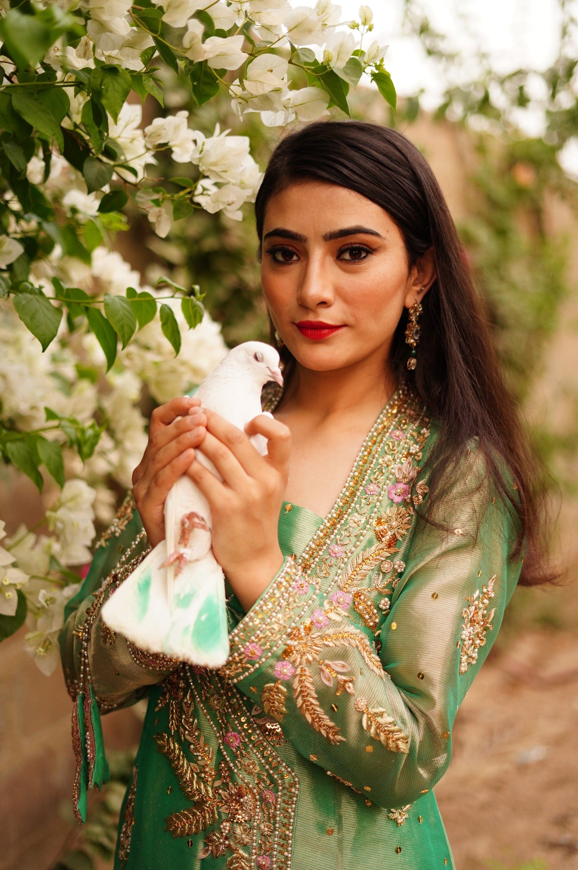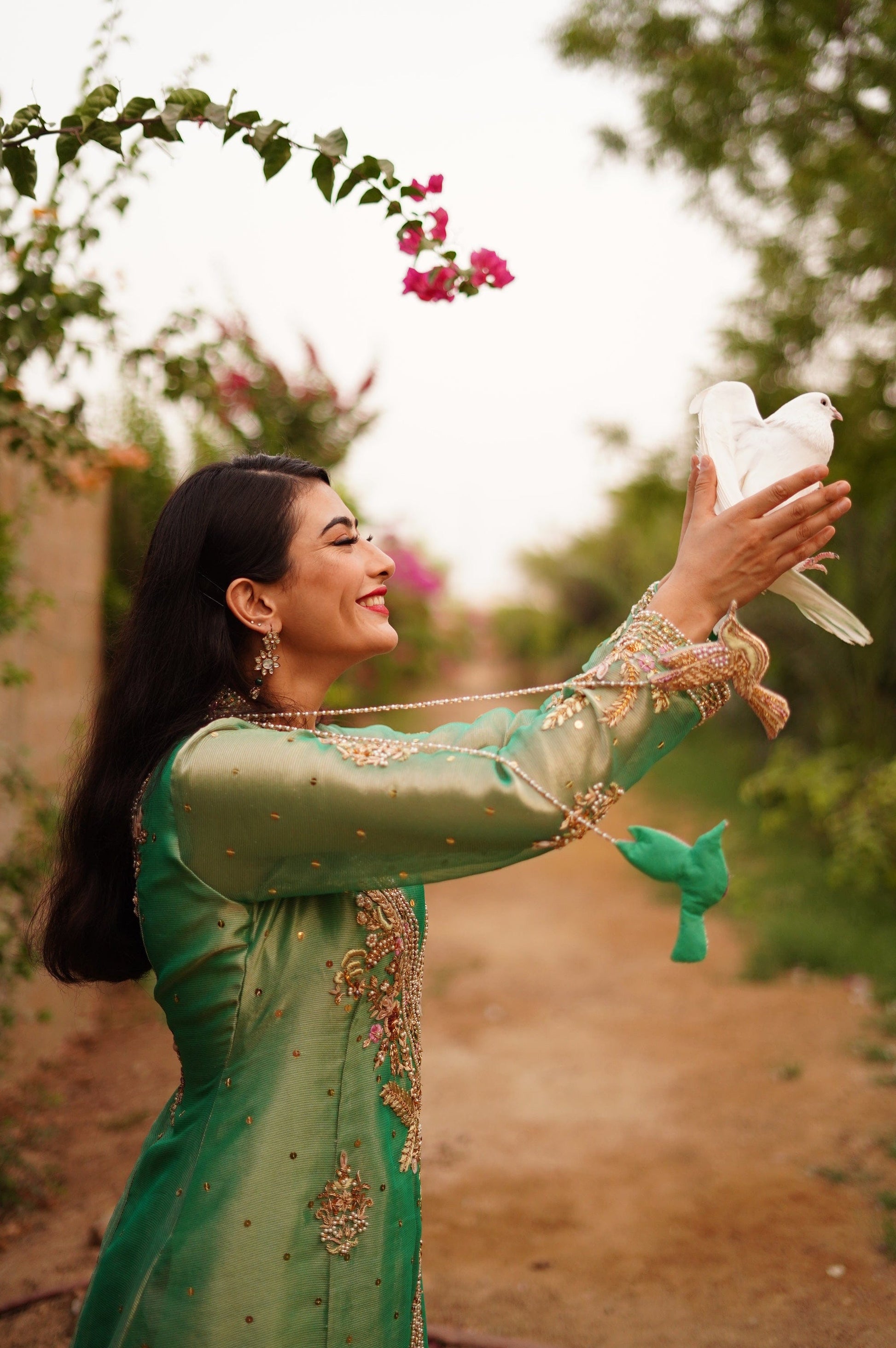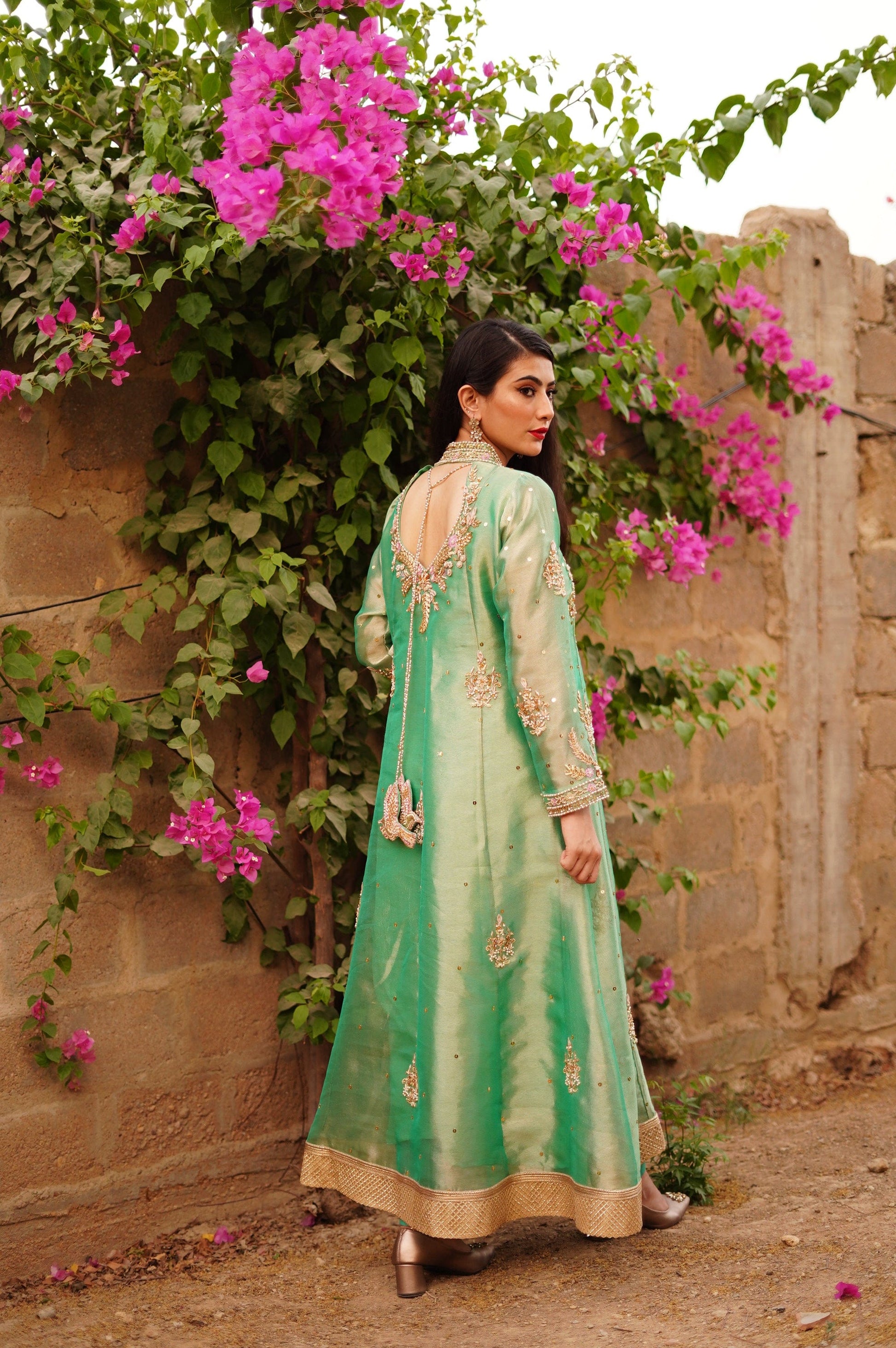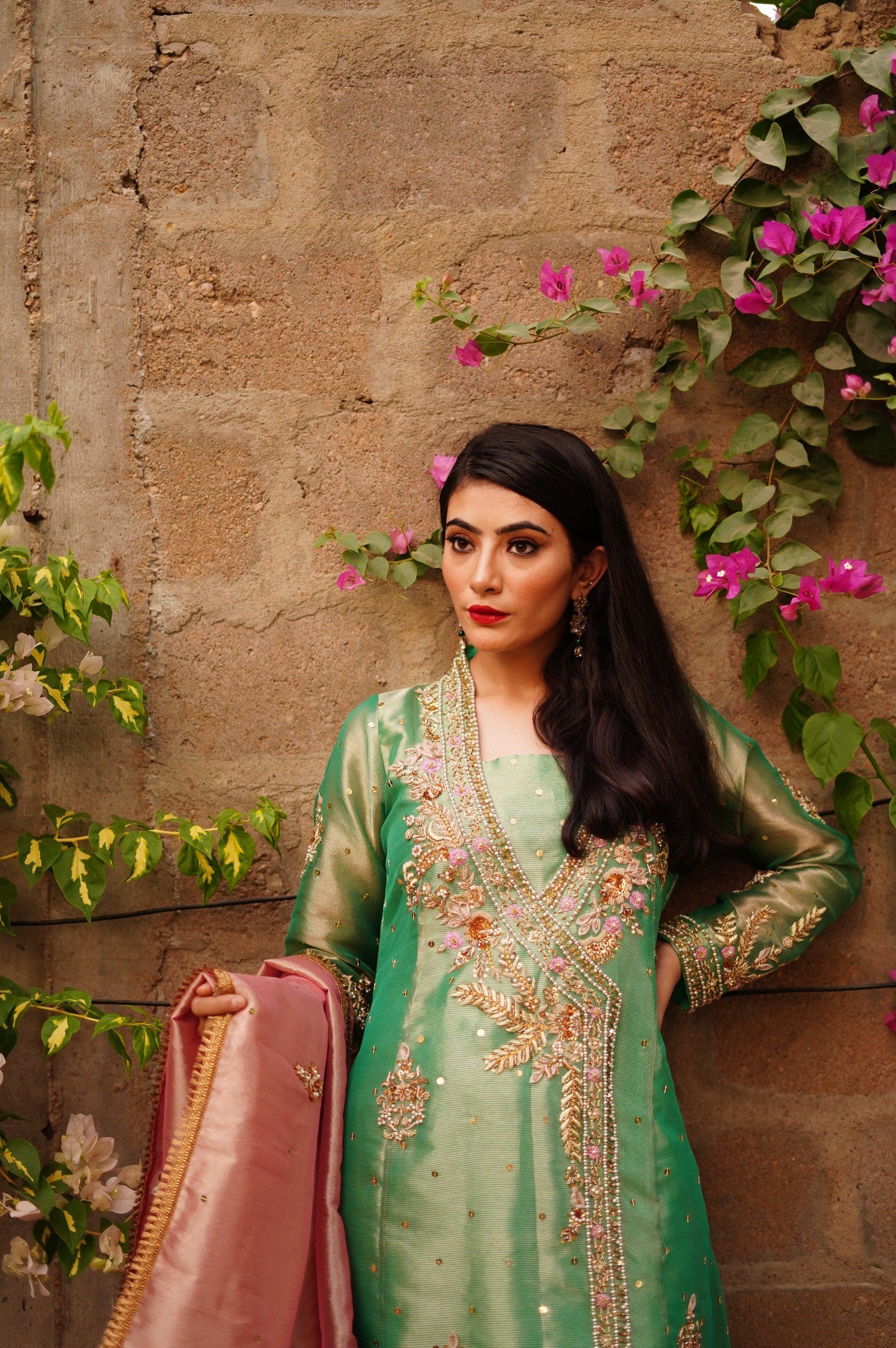 - HAND EMBROIDERED ANGRAKHA WITH ZARDOZI TECHNIQUE ON THE NECKLINE FRONT AND BACK AND ON THE SLEEVES EMBELLISHED WITH BEADS, GLASS CUT BEADS, DROP PEARL, KORA, AND DABKA. PAIRED WITH STRAIGHT PANTS AND A DUPATTA STYLIZED WITH GOTTA AND HAND-EMBROIDERED MOTIFS ALL OVER.
