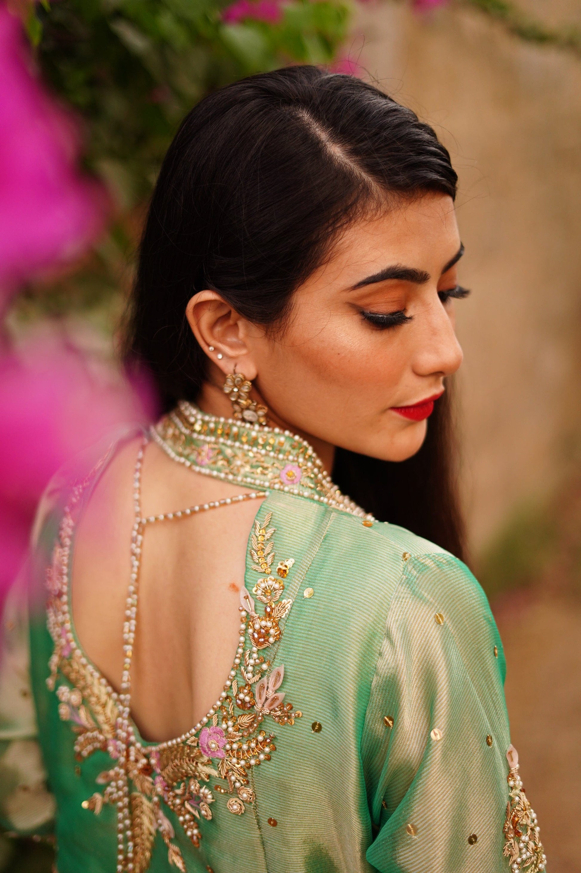 Hand embroidered angrakha with zardozi technique on the neckline front and back and on the sleeves embellished with beads, glass cut beads, drop pearl, kora, and dabka. Paired with straight pants and a dupatta stylized with gotta and hand-embroidered motifs all over.