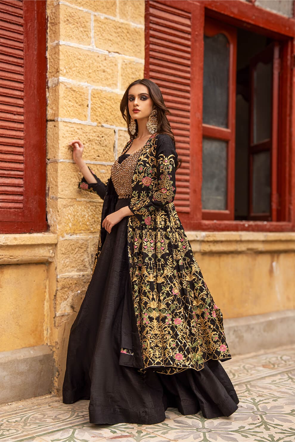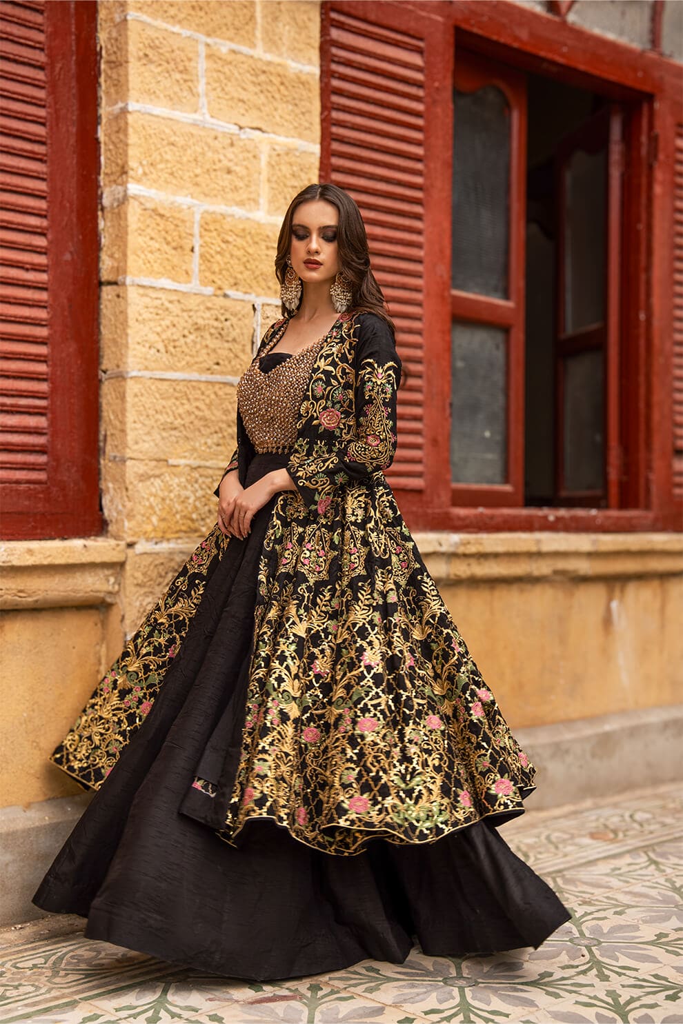 Characterized by a bold black raw silk base, Malika exhibits lively regal patterns elevated by intricate tilla and resham work, bursting with vibrant hues. This ensemble comprises a lehenga choli set paired with an avant-garde, hand-embroidered crystal bodice, exuding a whimsical aura of royal tradition. Additionally, an embroidered dupatta further enhances its captivating allure.