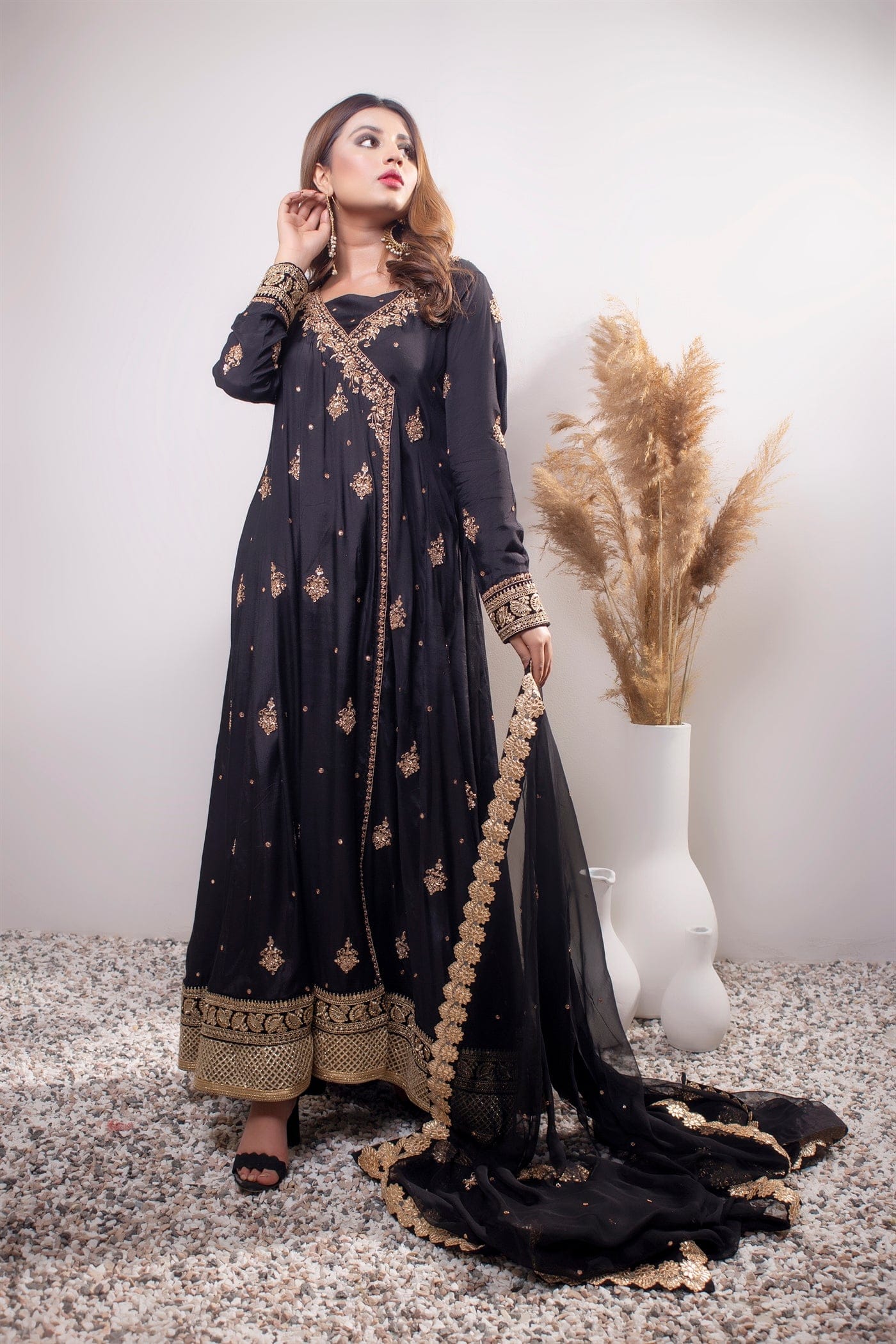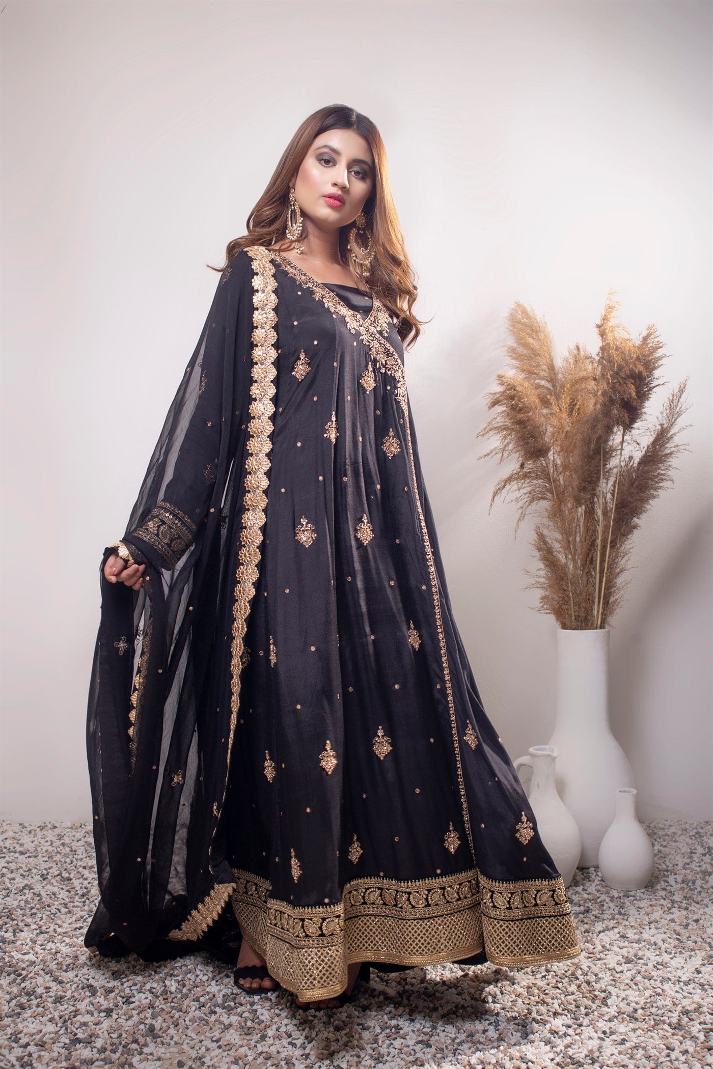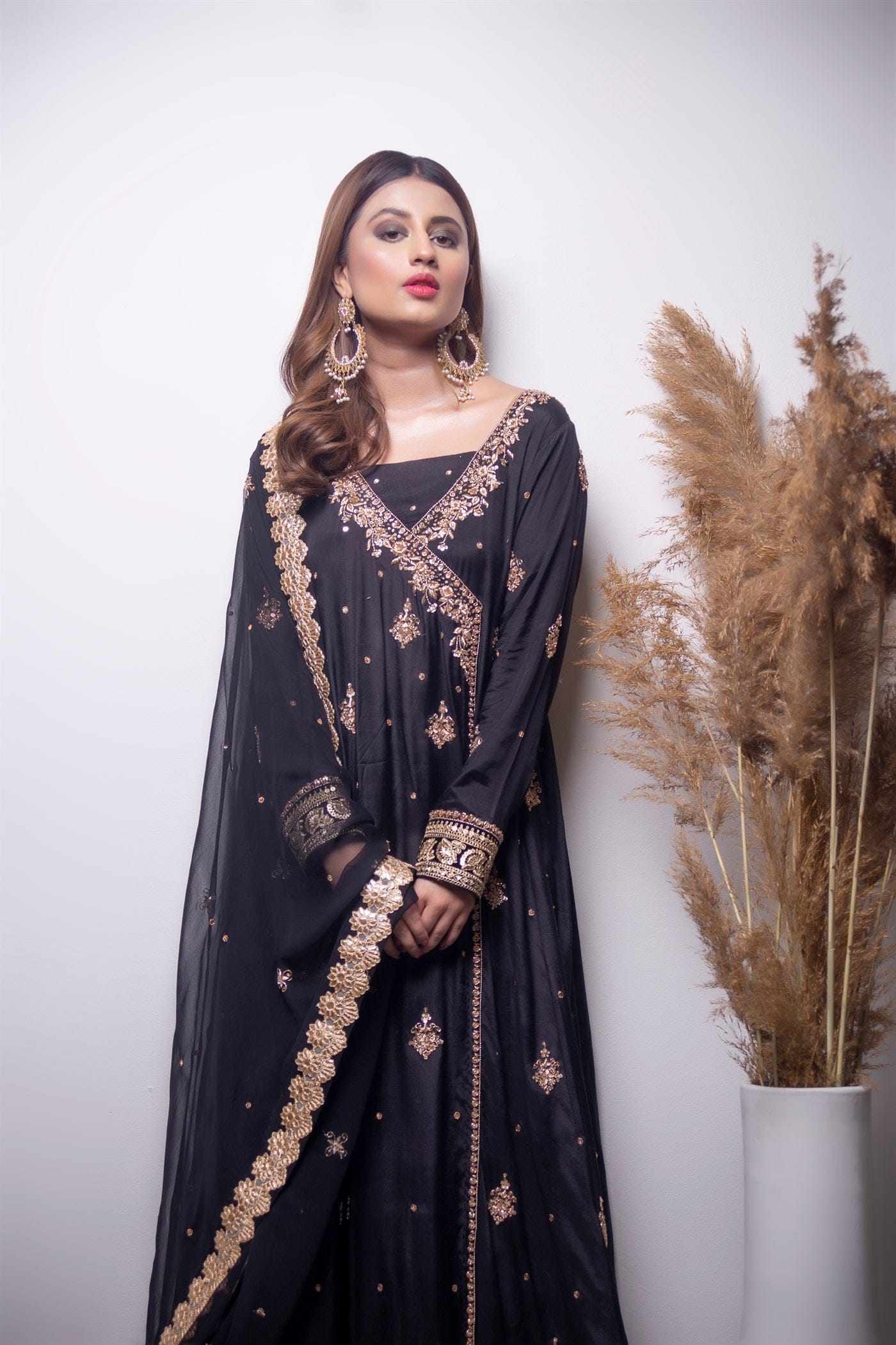 - HAND EMBROIDERED FULL-SLEEVED ANGHRAKHA WITH HAND WORK ON THE NECKLINE, AND SLEEVES EMBELLISHED WITH, GOLDEN KAT DANA, DROP PEARL, MOTI, CRYSTAL, KORA, AND DABKA. GOTTA STYLIZED HEM. PAIRED WITH STRAIGHT PANTS AND DUPATTA 4-SIDED GOTTA FINISHED, SEQUIN CHANN, AND HAND EMBROIDERED MOTIFS.