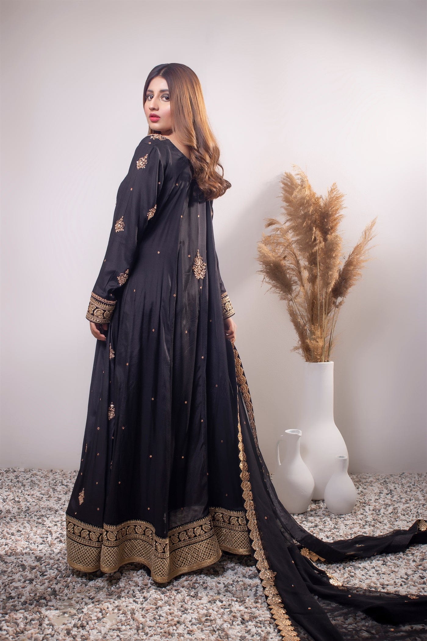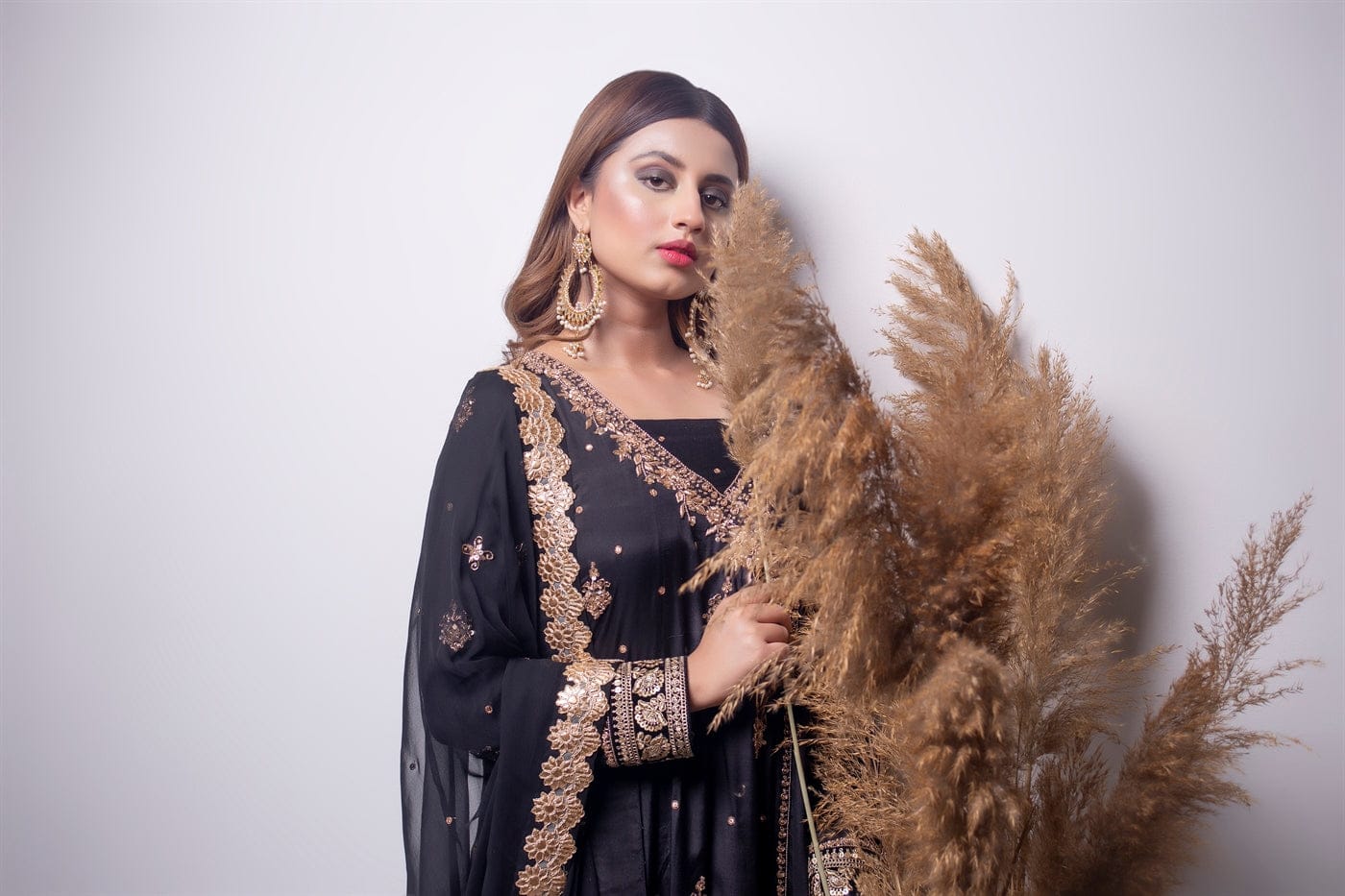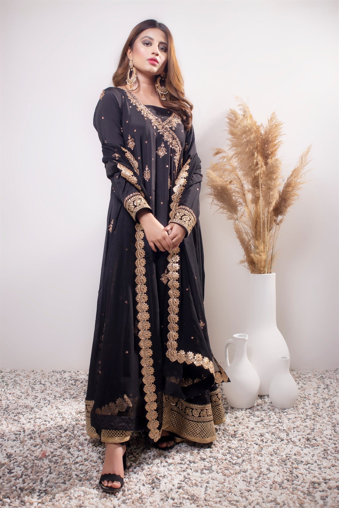 - HAND EMBROIDERED FULL-SLEEVED ANGHRAKHA WITH HAND WORK ON THE NECKLINE, AND SLEEVES EMBELLISHED WITH, GOLDEN KAT DANA, DROP PEARL, MOTI, CRYSTAL, KORA, AND DABKA. GOTTA STYLIZED HEM. PAIRED WITH STRAIGHT PANTS AND DUPATTA 4-SIDED GOTTA FINISHED, SEQUIN CHANN, AND HAND EMBROIDERED MOTIFS.