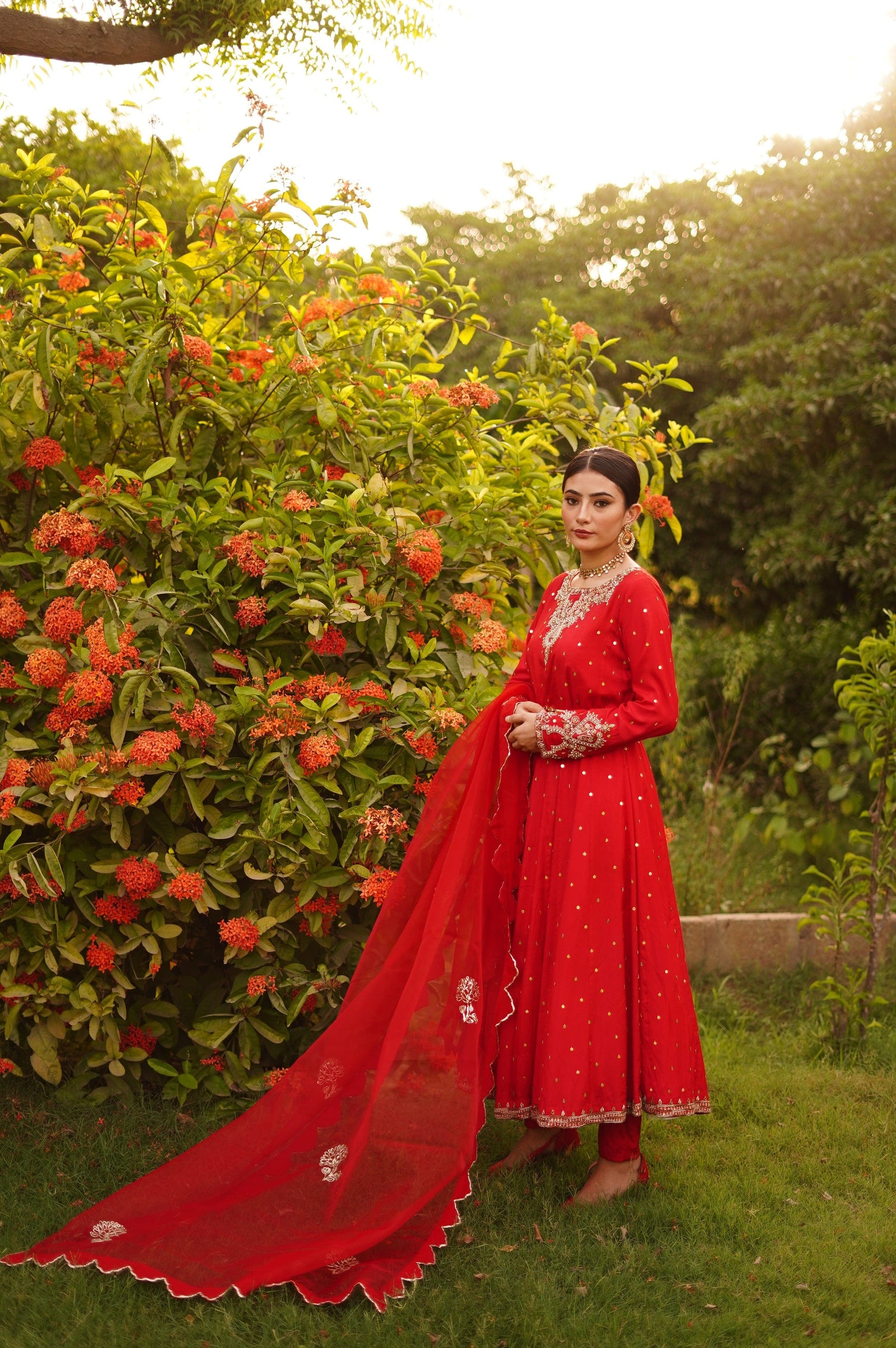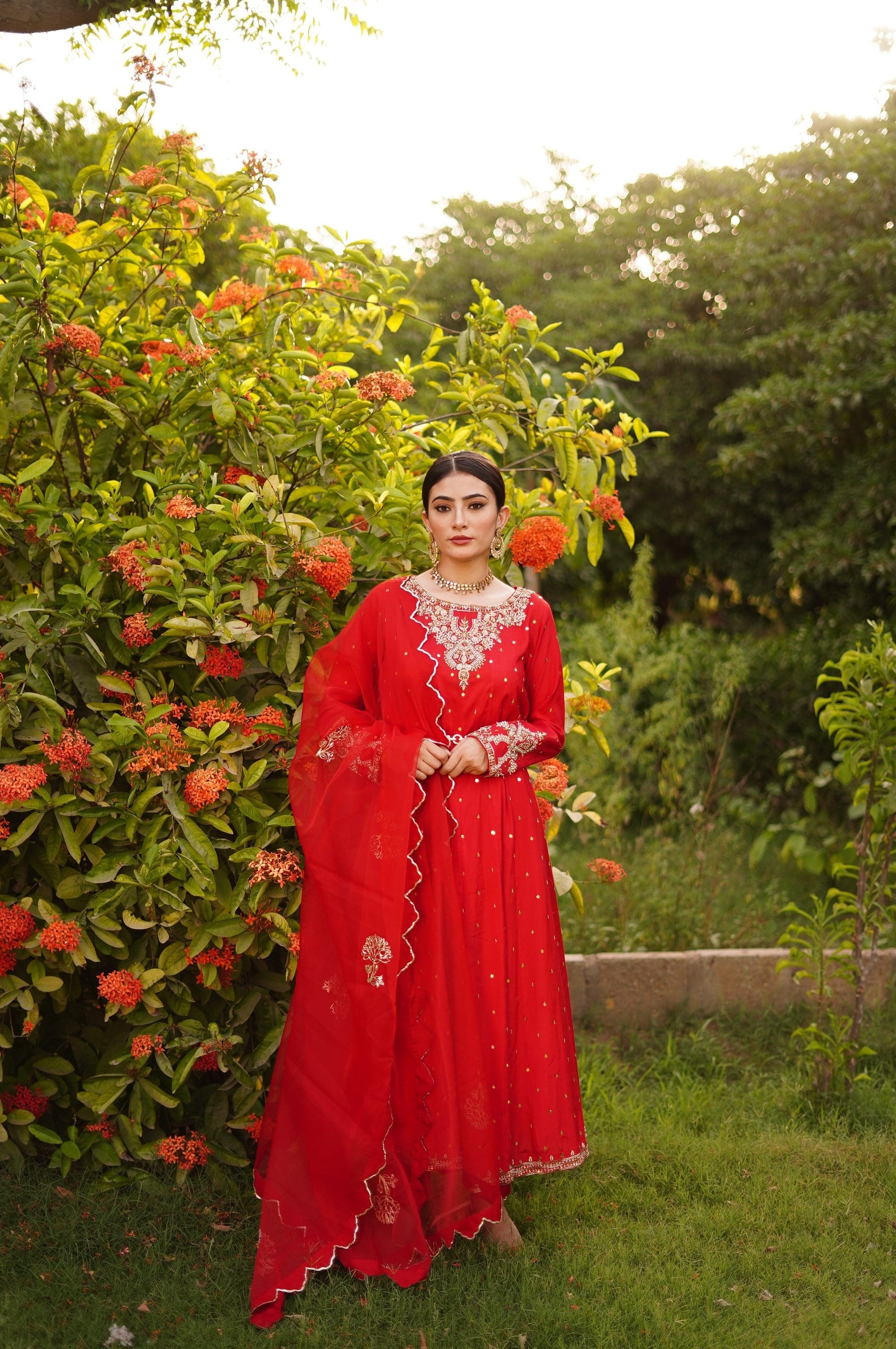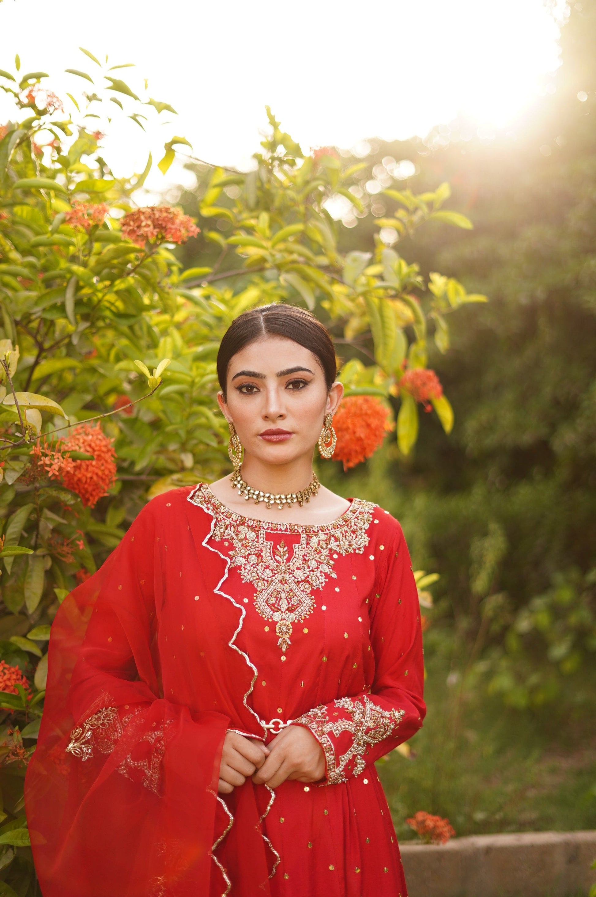 Hand embroidered peshwas with hand work on the neckline front and sleeves embellished with glass cut beads, drop pearl, crystal, kora, and dabka. Paired with straight pants and dupatta 4-sided scalloped finished with pita work and hand embroidered motifs all over.