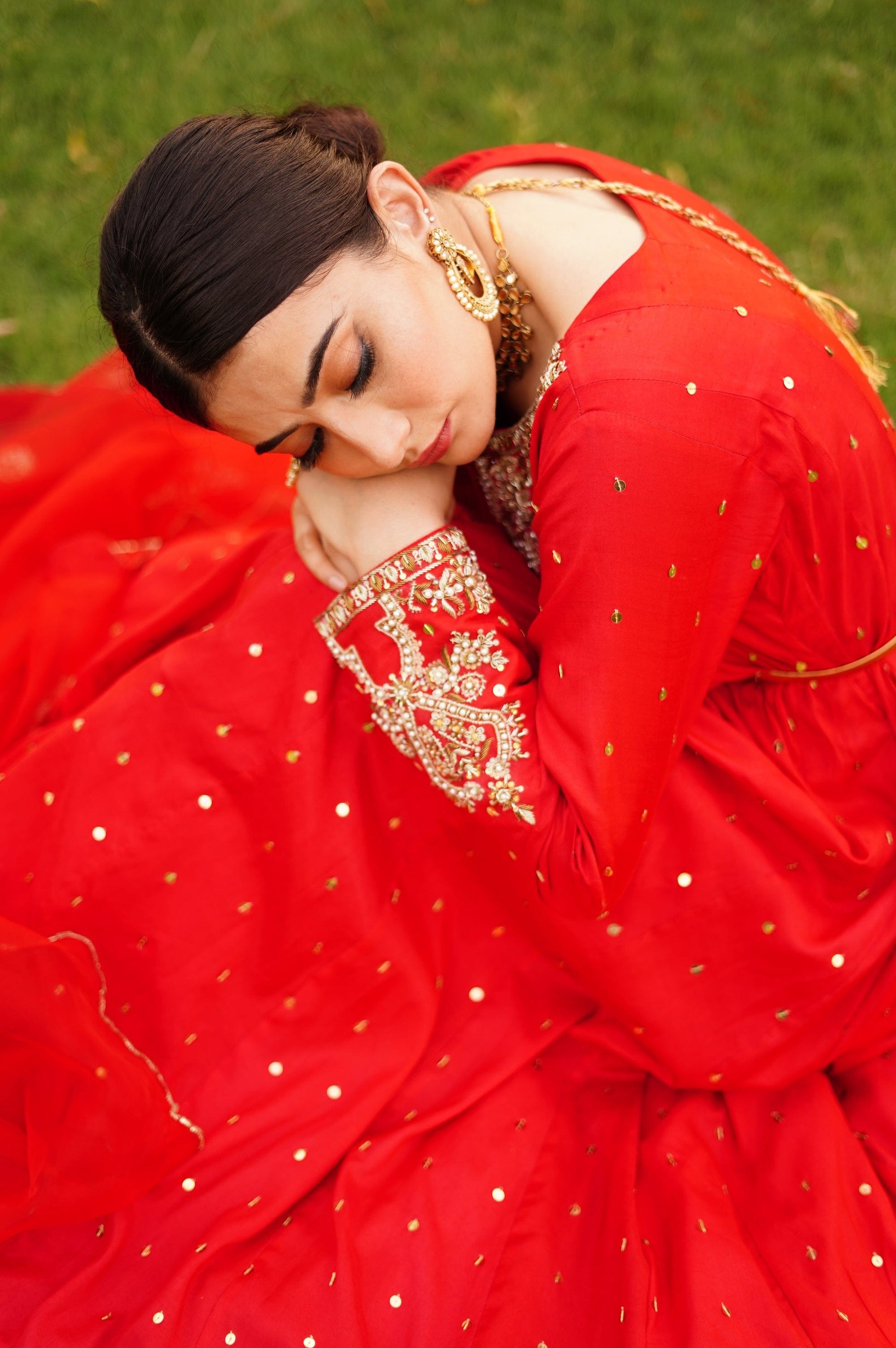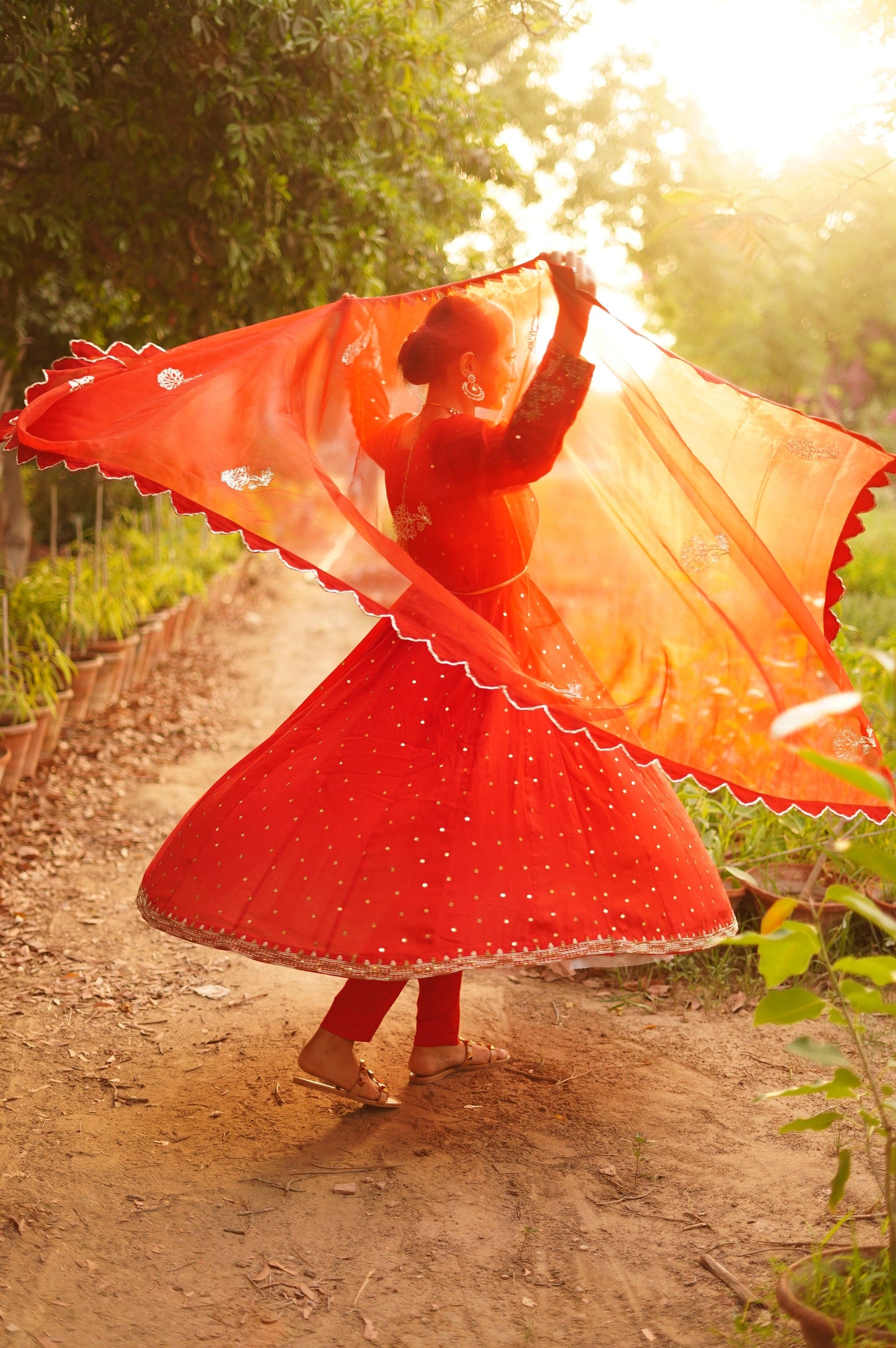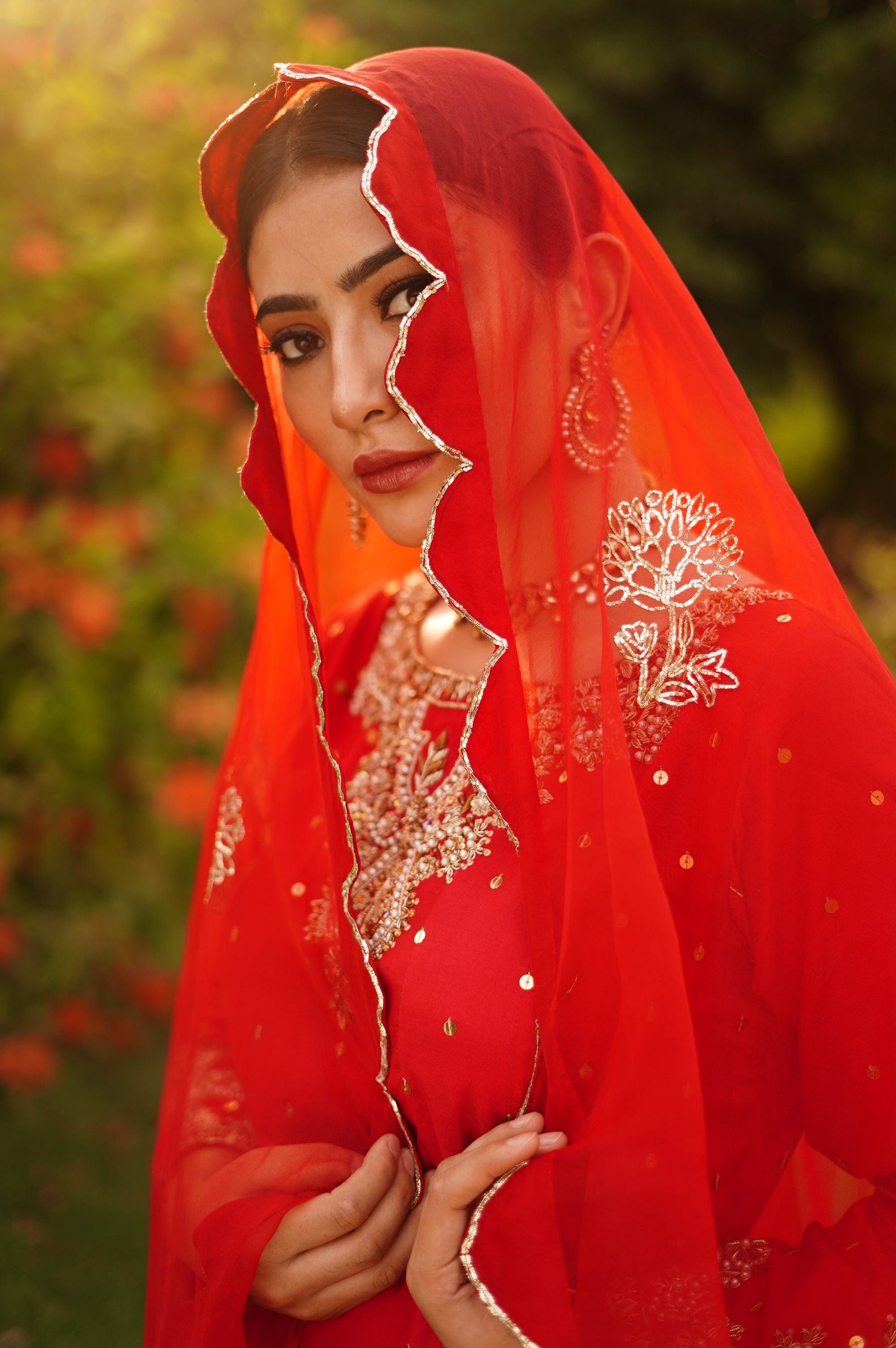 Hand embroidered peshwas with hand work on the neckline front and sleeves embellished with glass cut beads, drop pearl, crystal, kora, and dabka. Paired with straight pants and dupatta 4-sided scalloped finished with pita work and hand embroidered motifs all over.