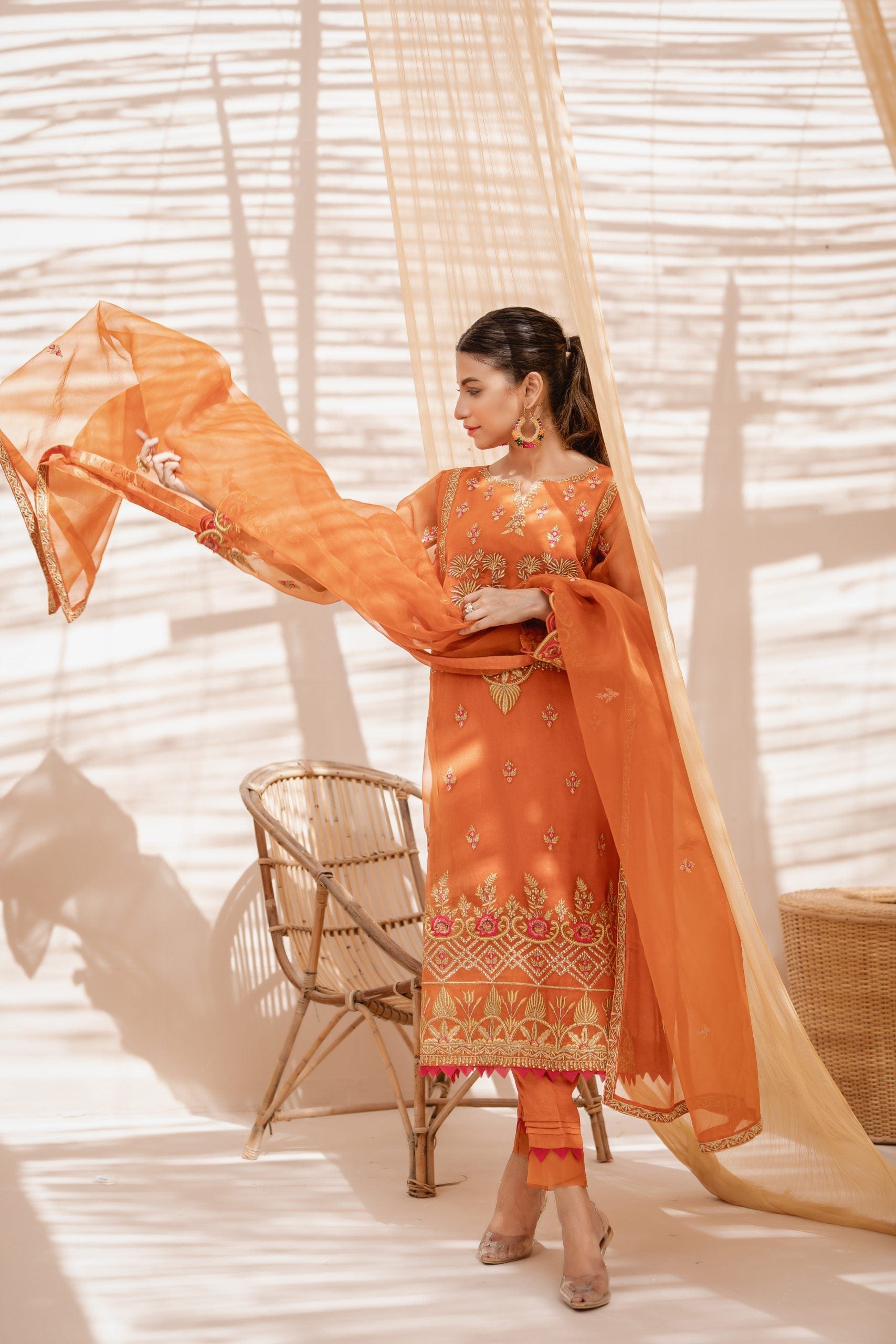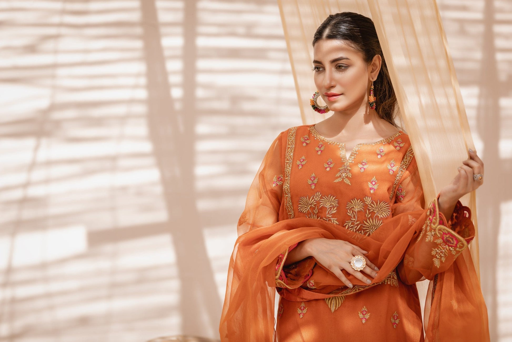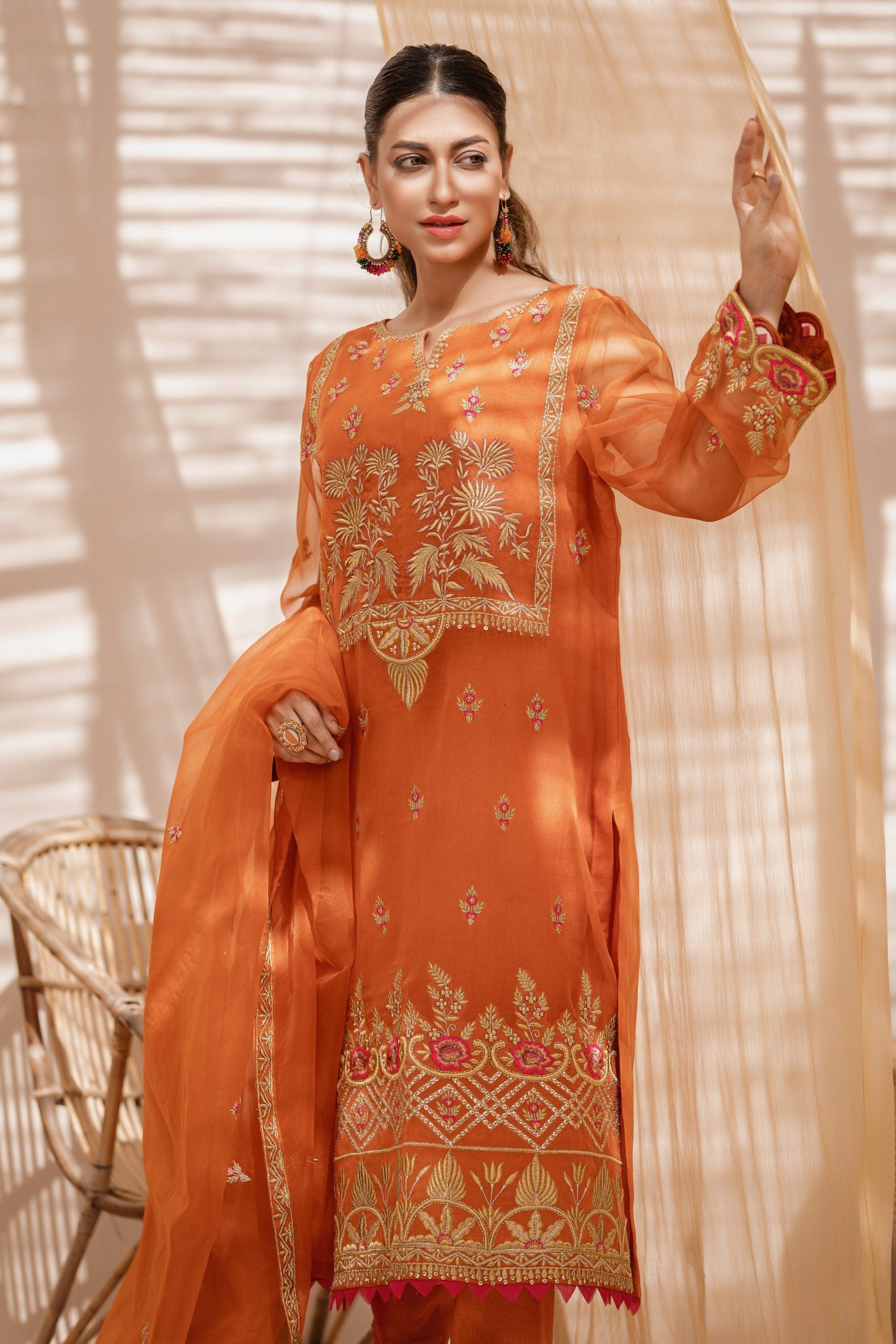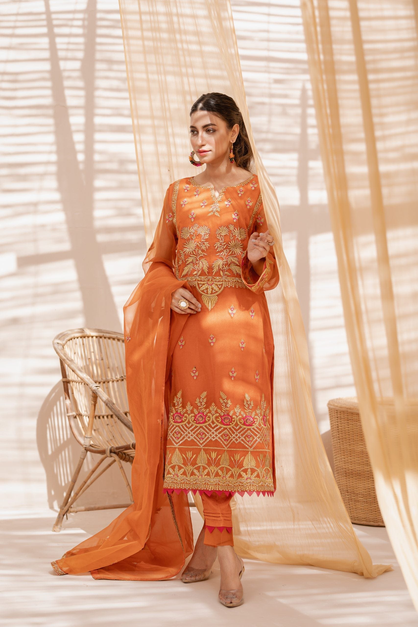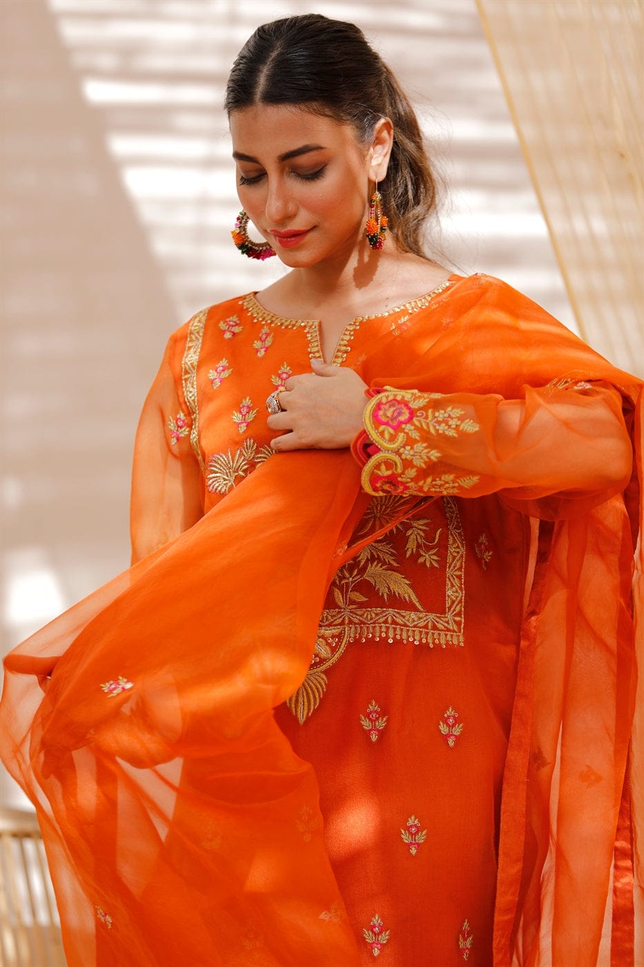 Rust Organza full-sleeved shirt, heavilyembroidered with tilla and resham thread technique on the front back and sleeves with heav motifs. The shirt has Raw Silk inner lining attached.
