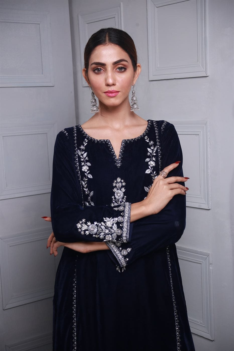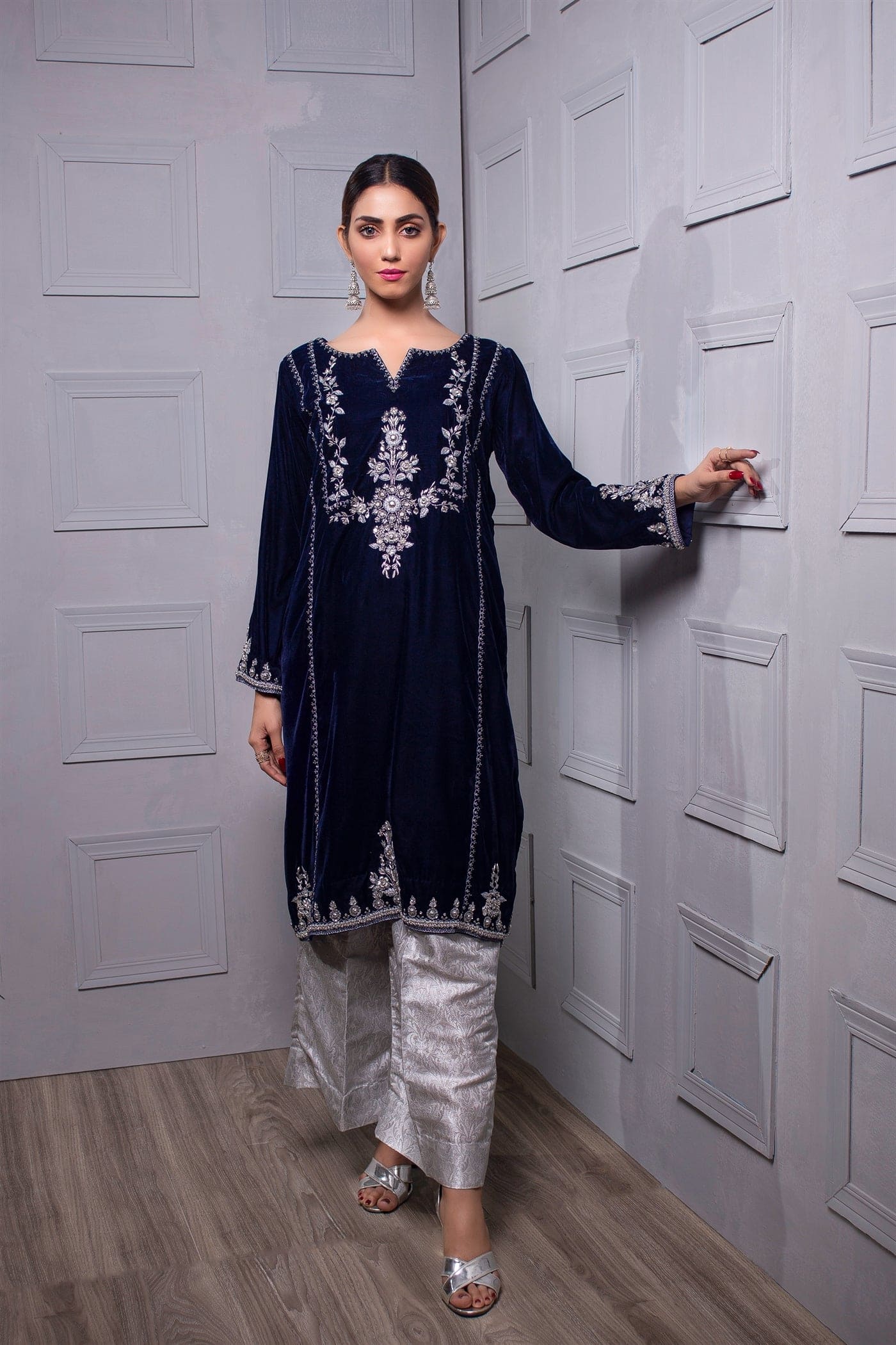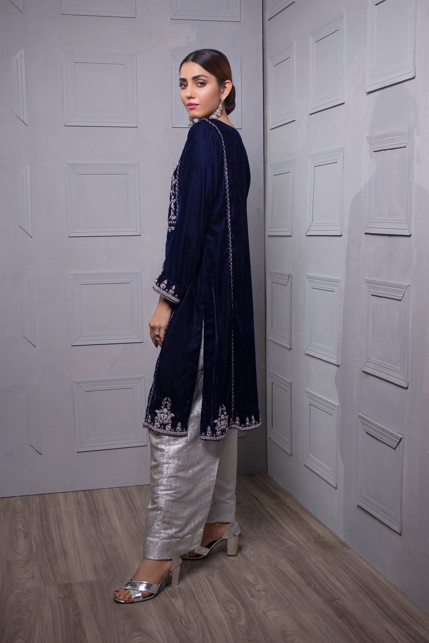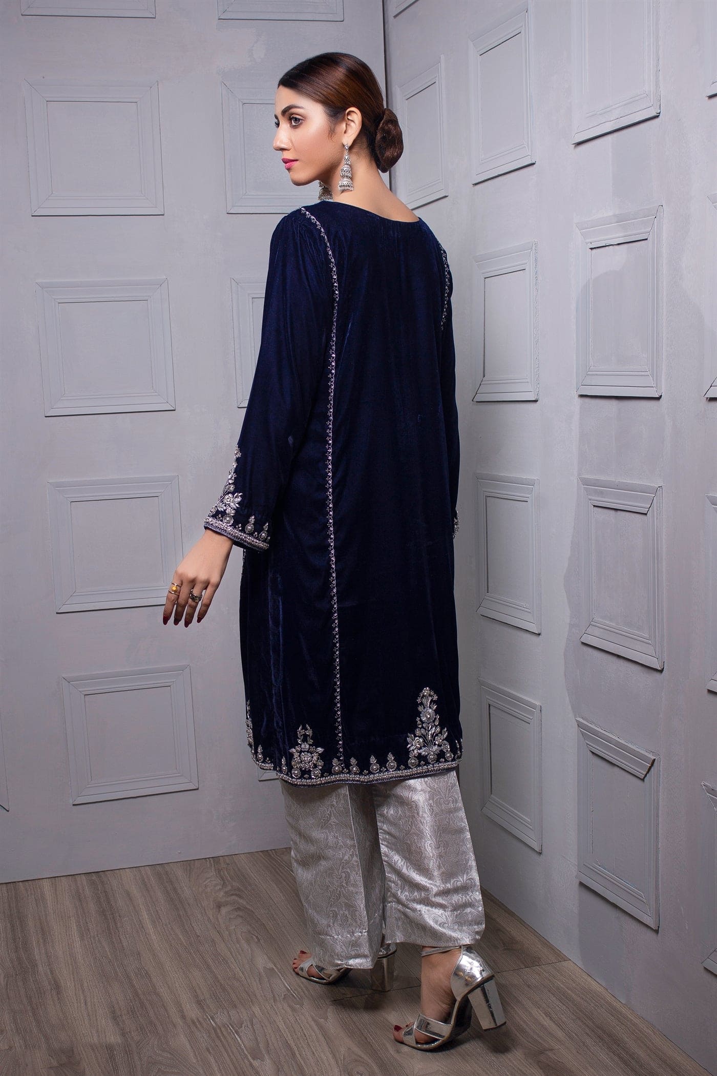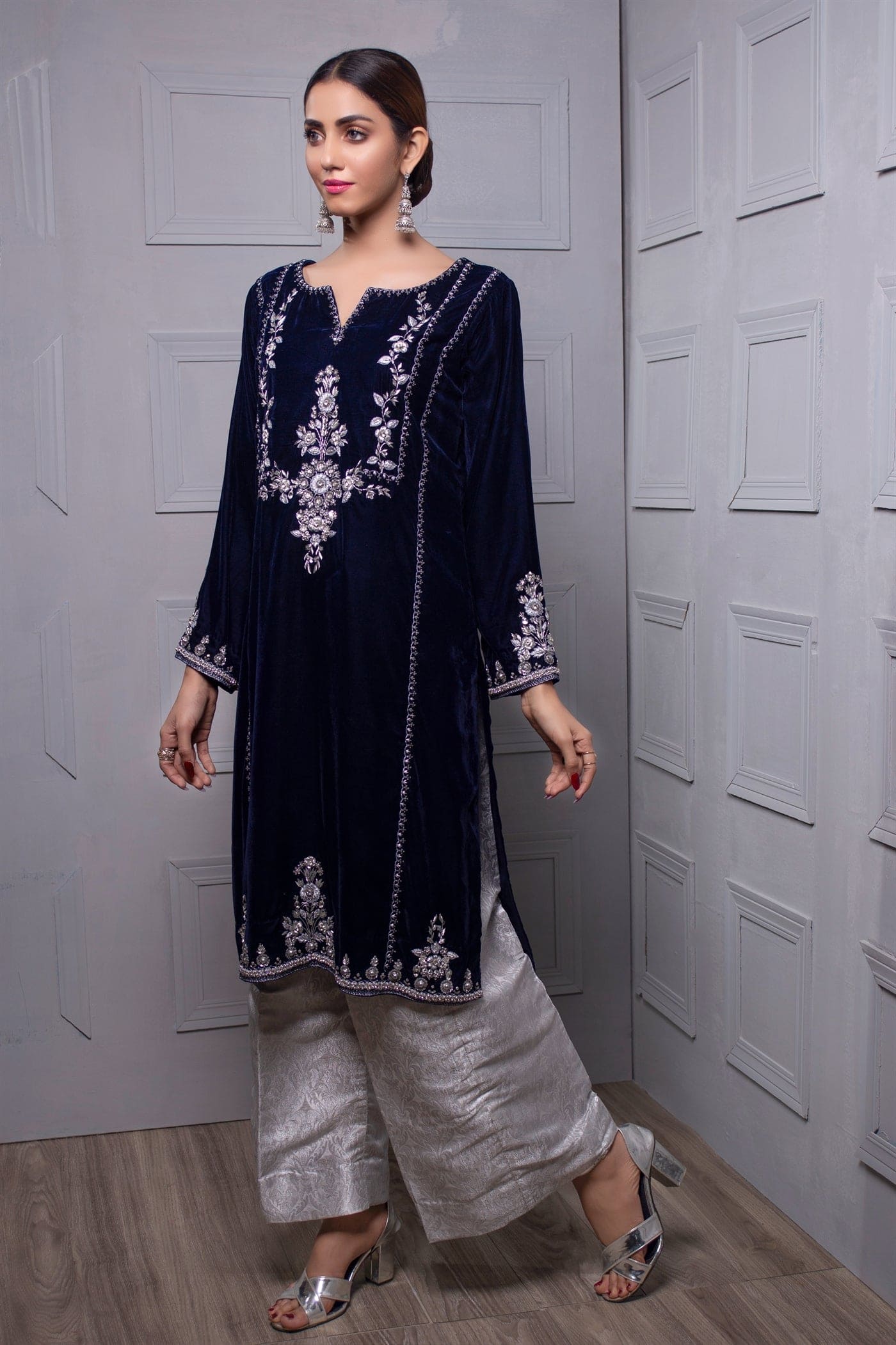 - HAND-EMBROIDERED FULL-SLEEVED LONG SHIRT WITH HANDWORK ON THE FRONT, BACK, AND SLEEVES. EMBELLISHED WITH, SILVER SEQUINS, KAT DANA, DROP PEARL, MOTI, CRYSTAL, KORA, AND DABKA. PAIRED WITH WIDE-LEG BANARASI PANTS.
