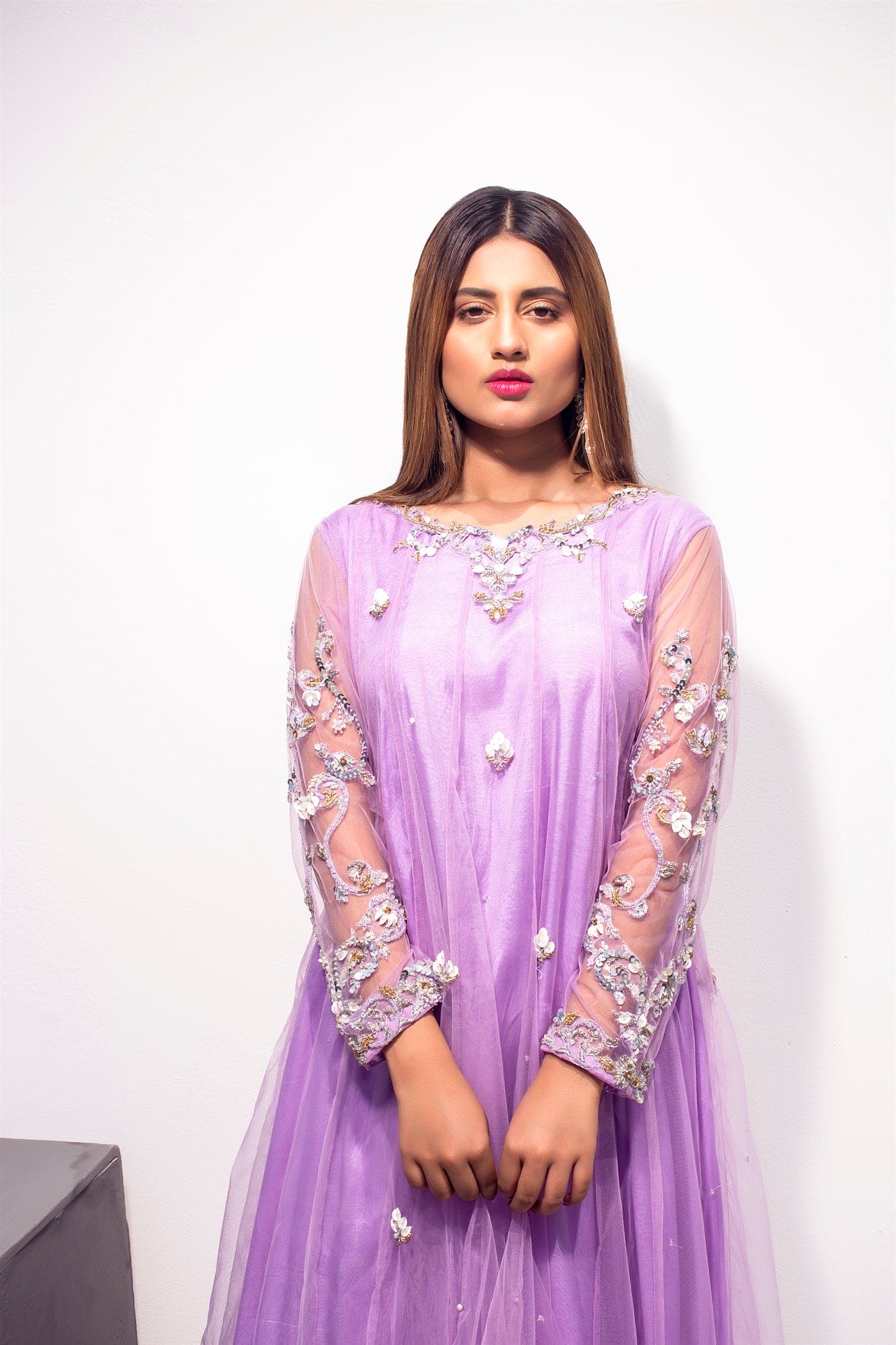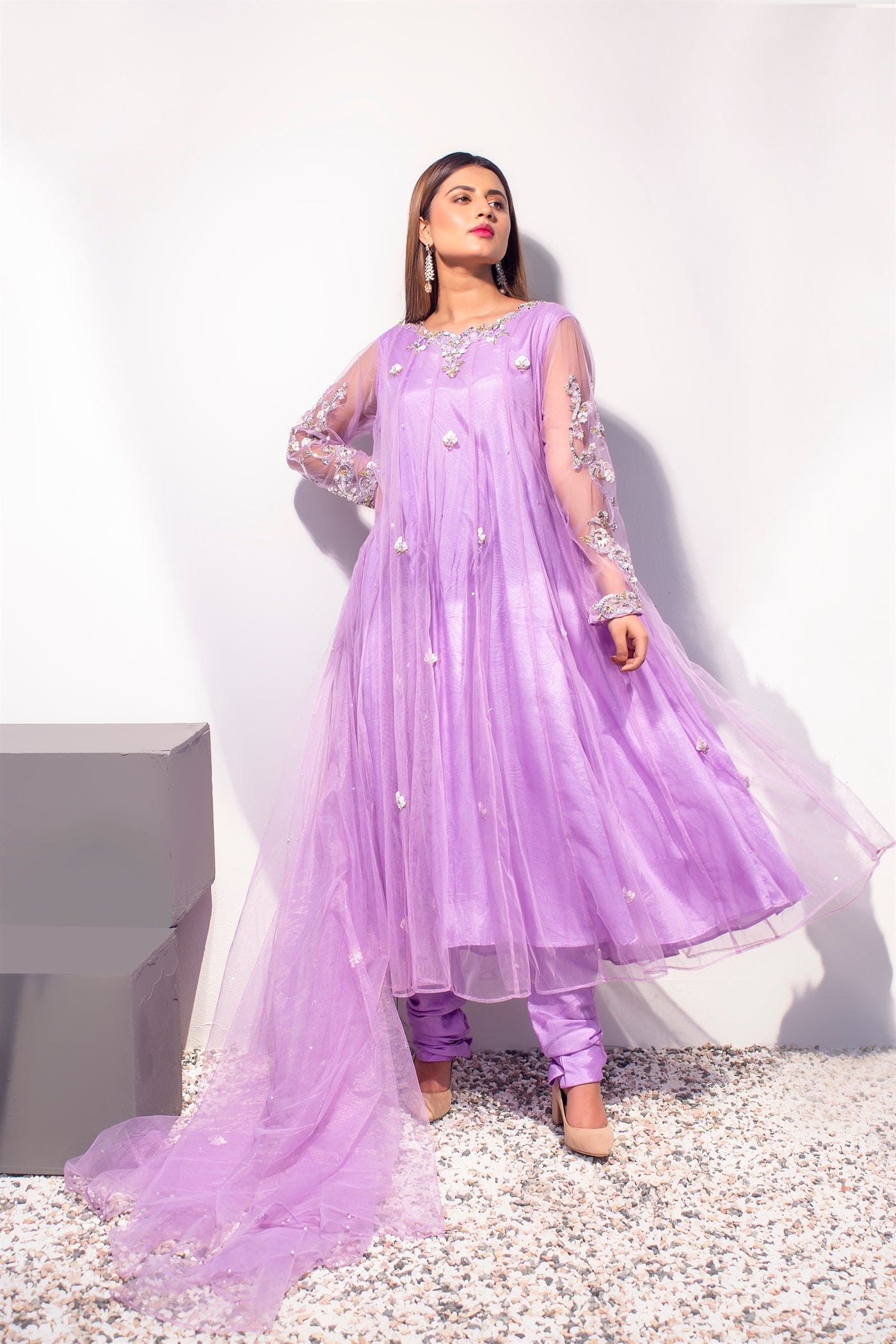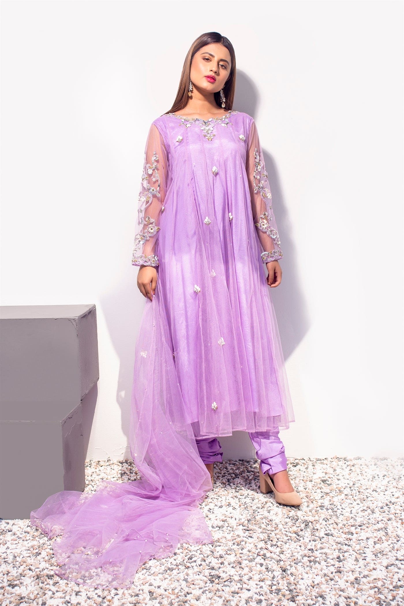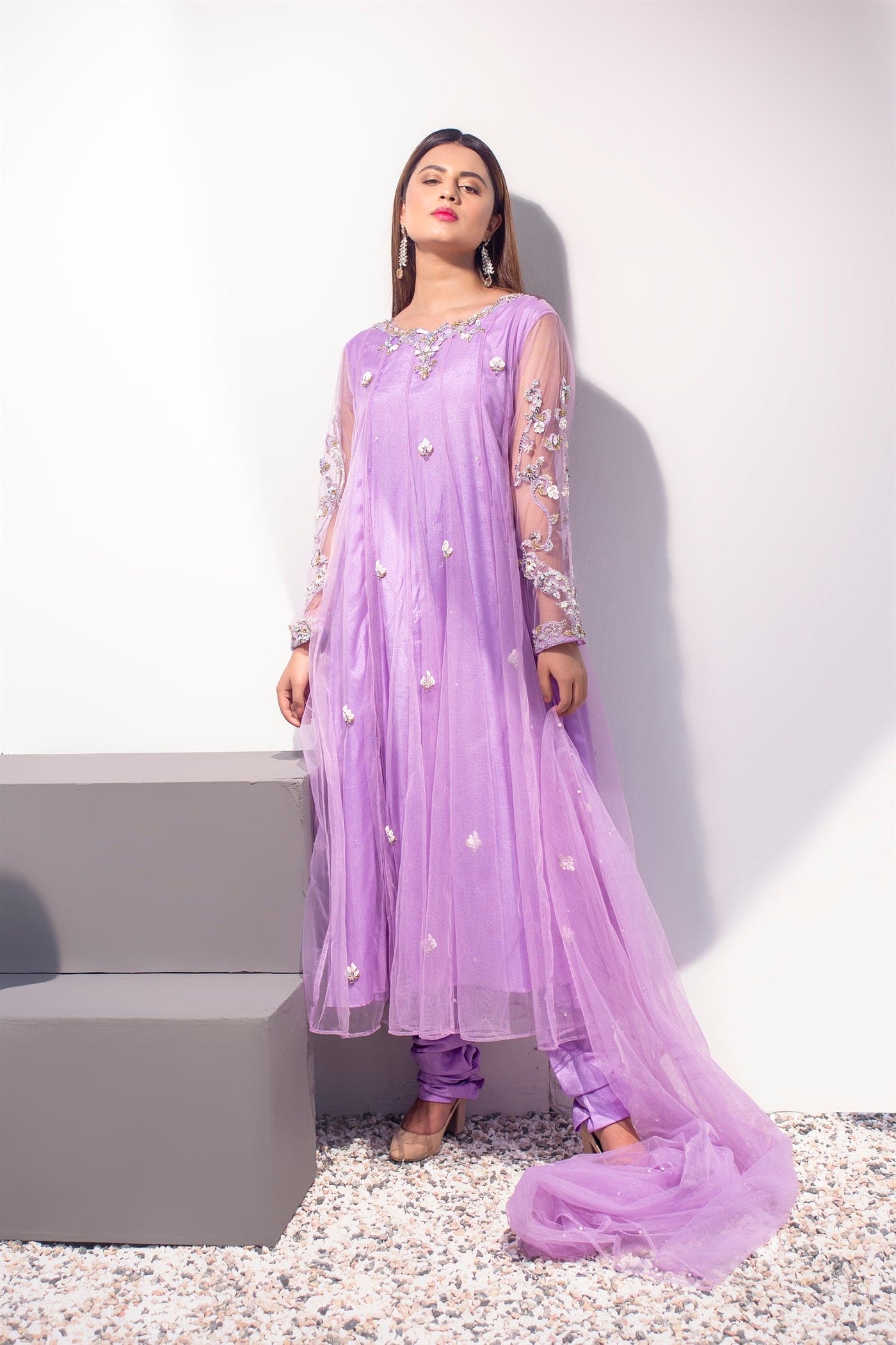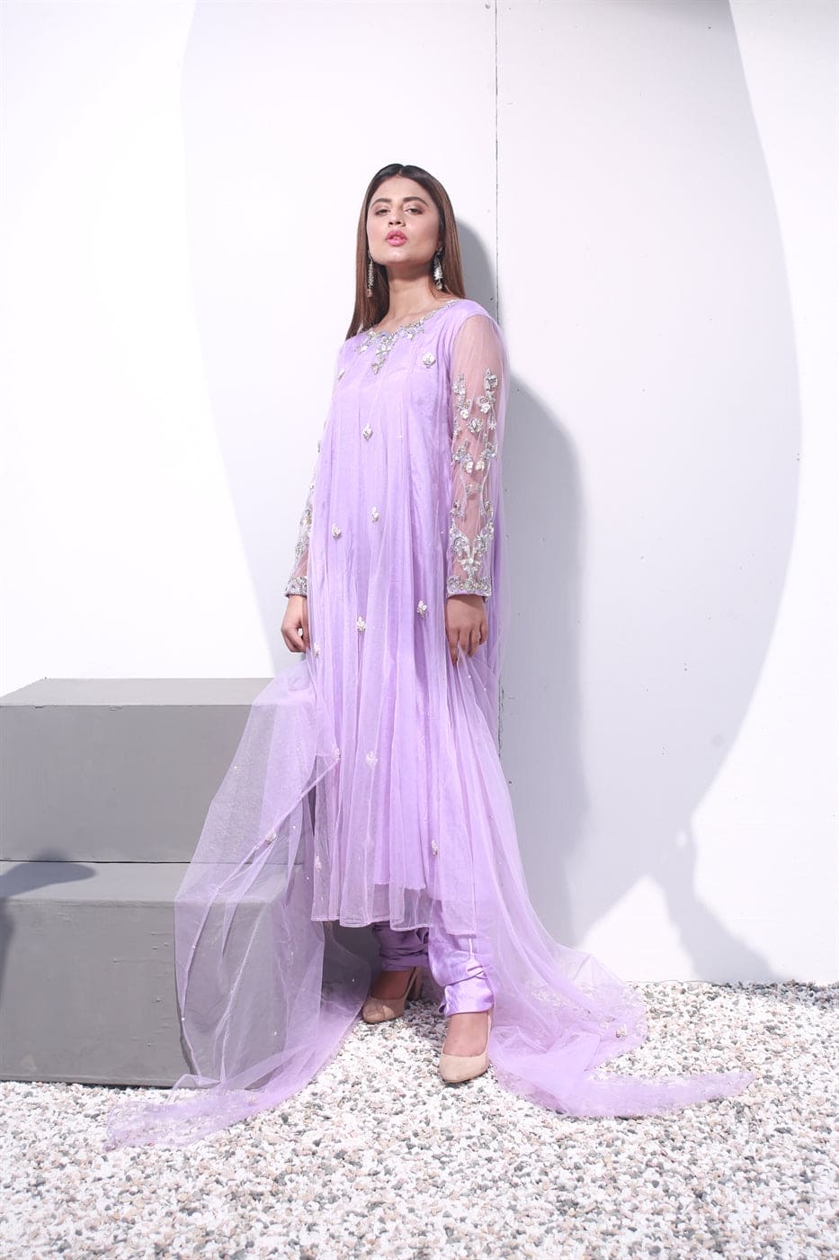 Hand embroidered full-sleeved kalidaar with hand work on the neckline and sleeves. Embellished with 3d technique, silver kat dana, drop pearl, moti, crystal, white sequins, kora, and dabka. Paired with straight pants and a dupatta sequins sprayed with chann and motifs.