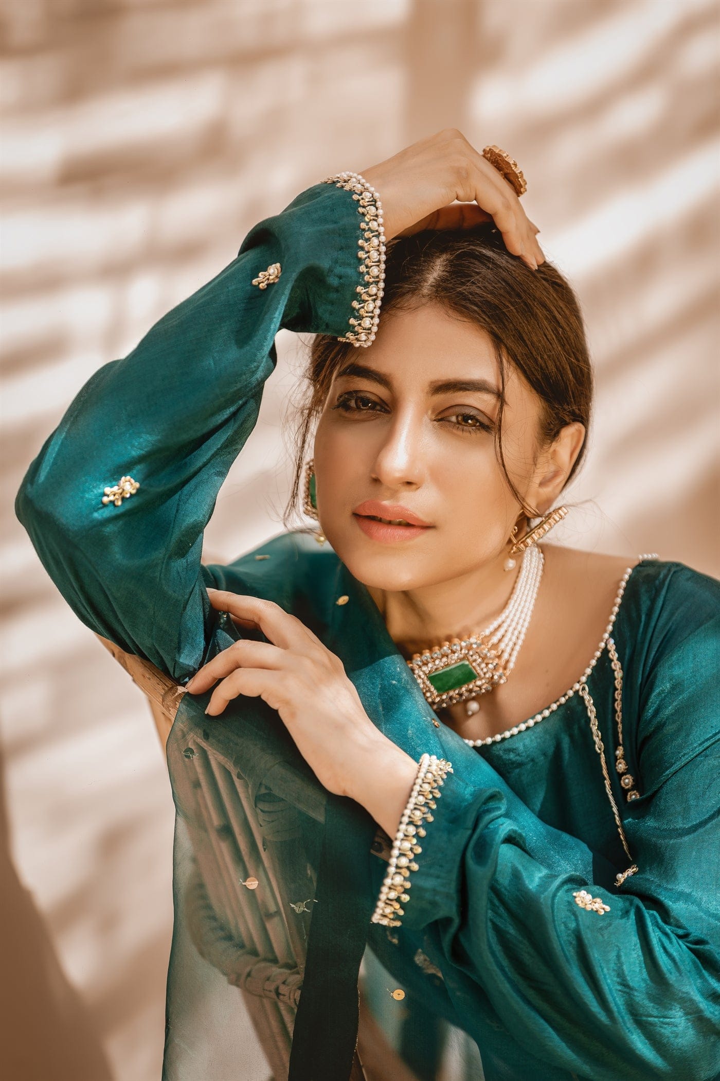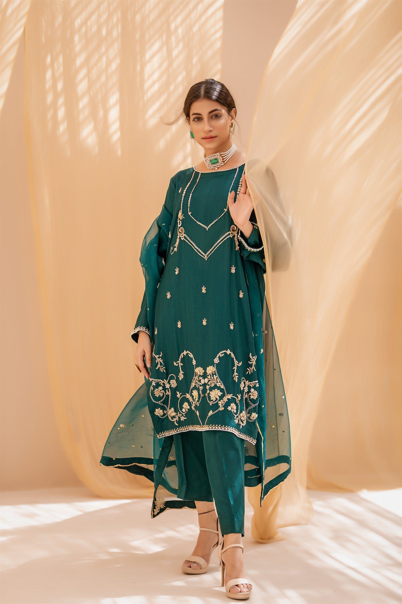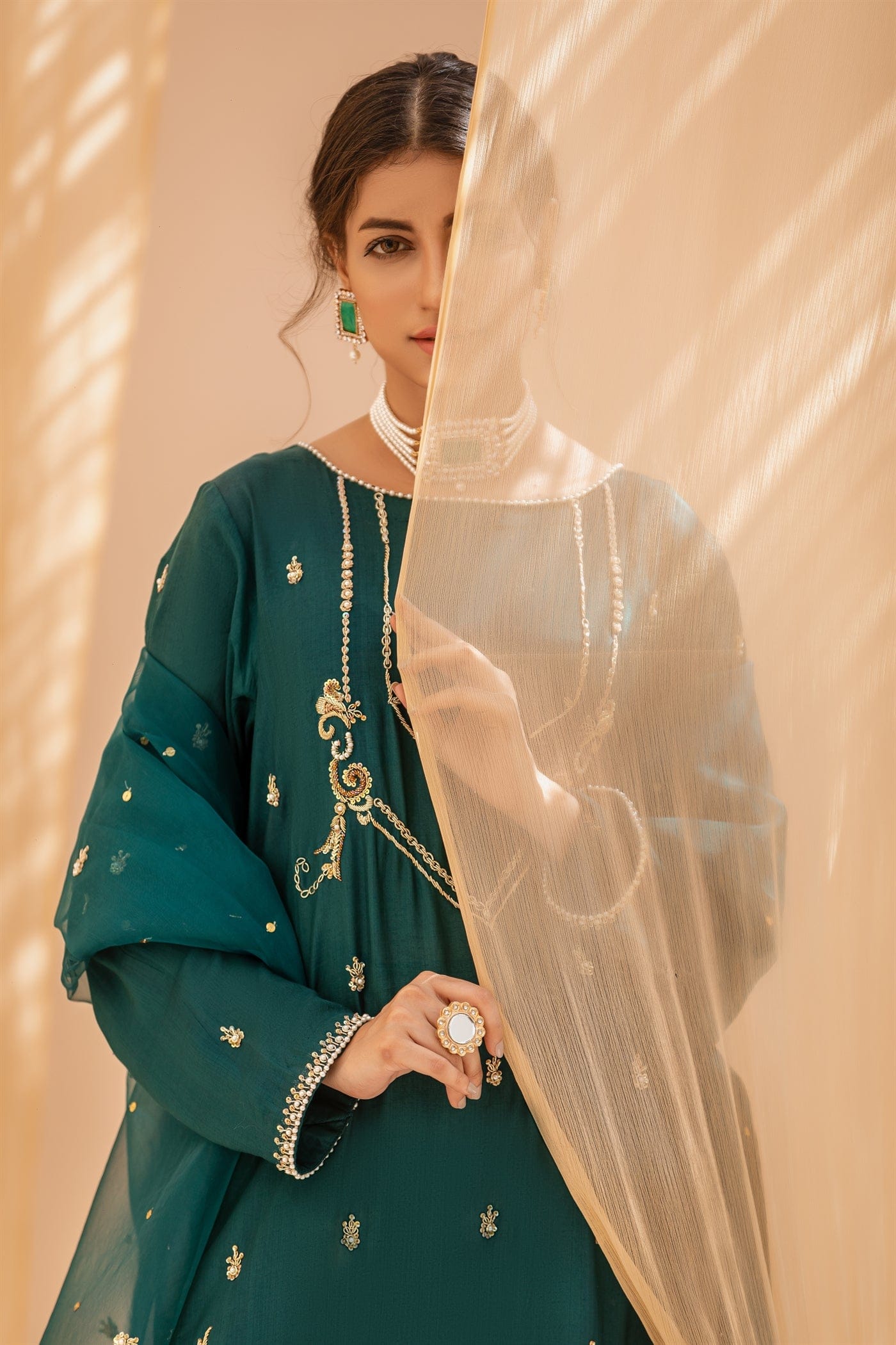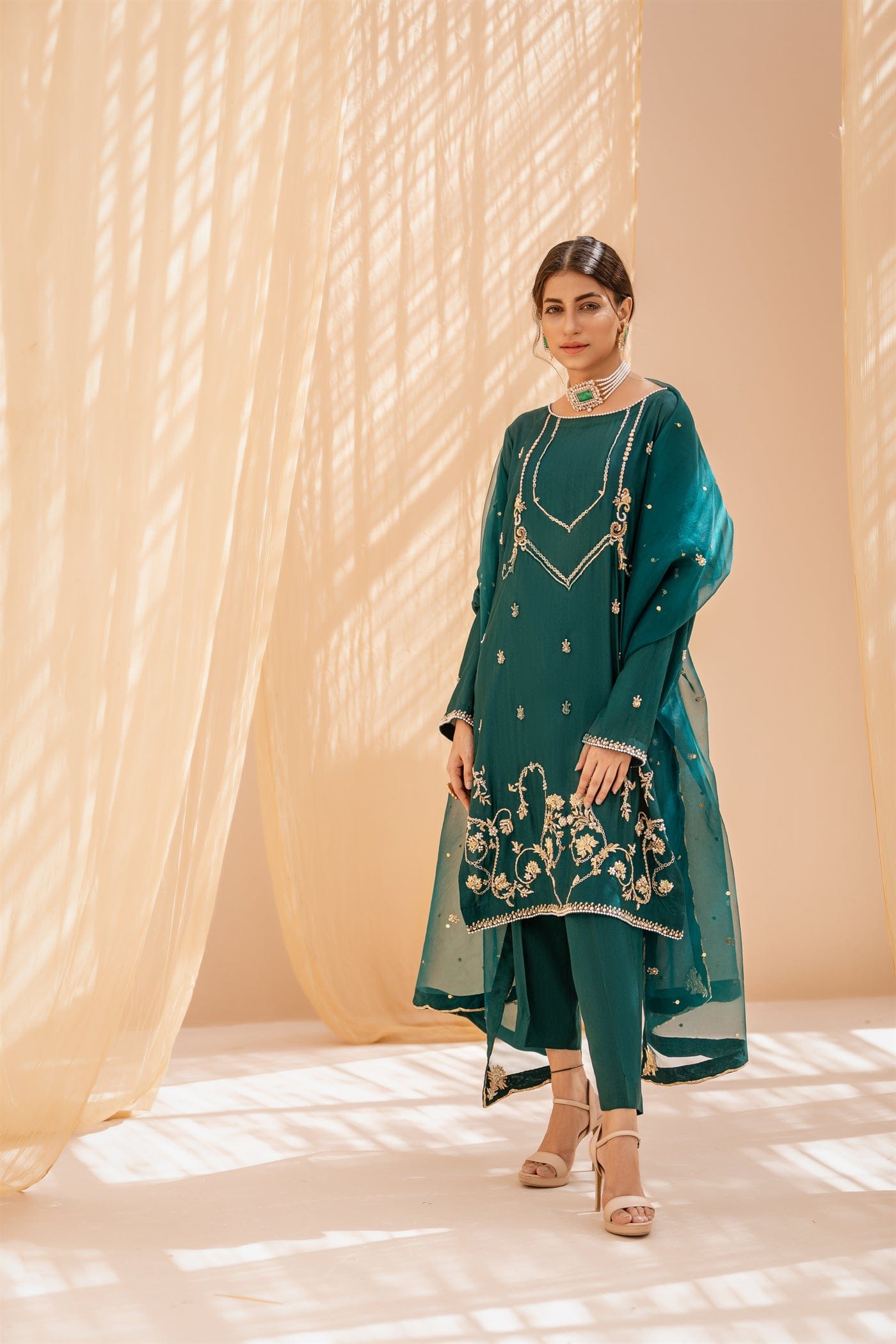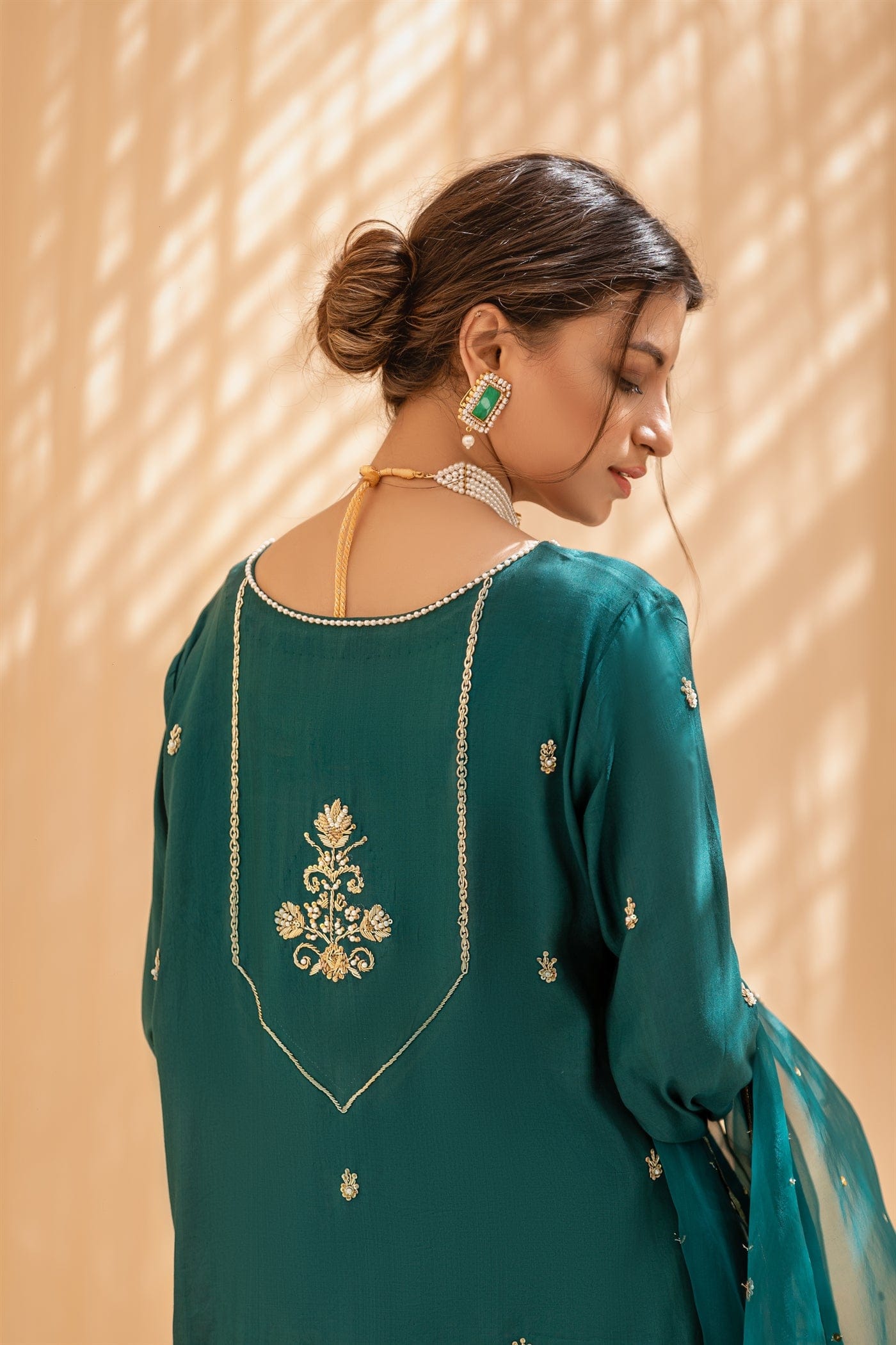 - HAND EMBROIDERED FULL-SLEEVED SHIRT WITH HAND WORK ON THE NECKLINE, SLEEVES, AND HEM EMBELLISHED WITH, GOLDEN KAT DANA, DROP PEARL, MOTI, CRYSTAL, KORA, AND DABKA. PAIRED WITH STRAIGHT PANTS AND A DUPATTA HAND SPRAYED WITH CHANN AND MOTIFS.